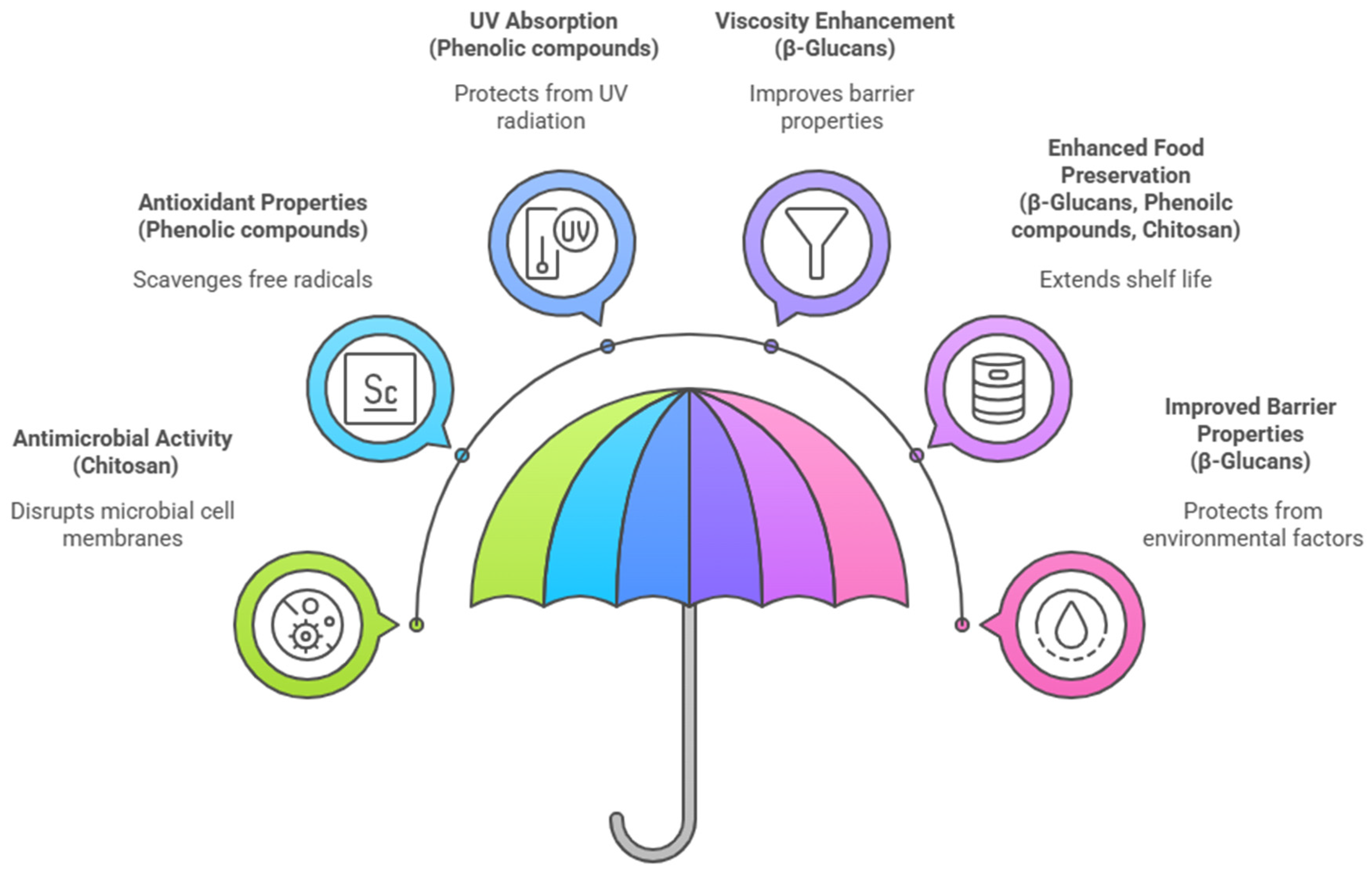 Mushroom-derived compounds have emerged as potent multifunctional additives. These include natural polymers like chitin and chitosan, phenolic compounds, and polysaccharides, which naturally evolved as protective agents in fungi [52]. These natural polymers and secondary metabolites, evolved over millions of years to protect fungal organisms from environmental stresses, now offer similar protective benefits when incorporated into packaging systems [53]. For example, chitin-chitosan complexes offer structural support and antimicrobial action, while phenolics contribute antioxidant and UV-absorbing properties [54]. β-glucans, another key component, enhance film formation and maintain bioactivity, making them ideal for packaging systems requiring integrated functional performance [55].