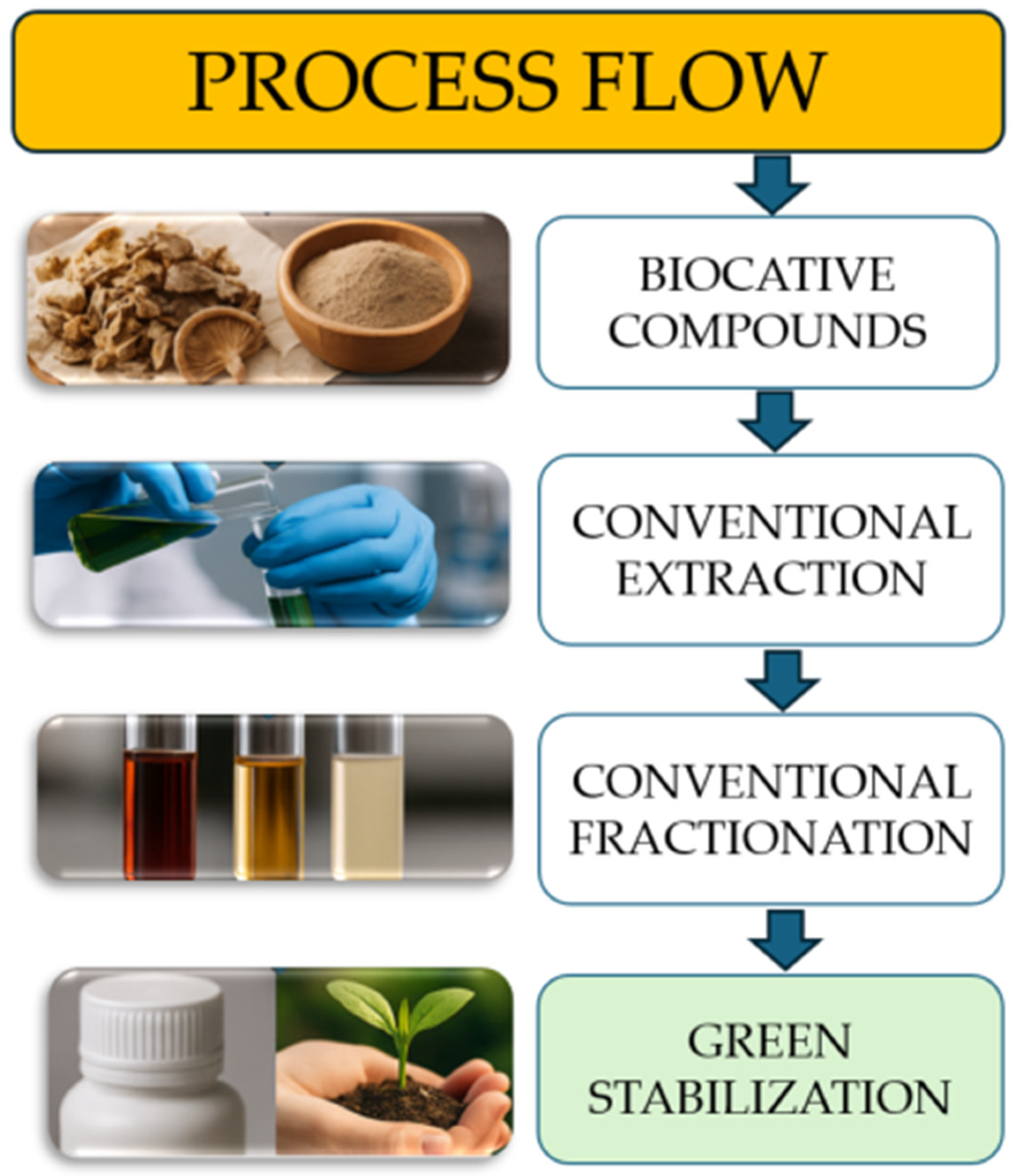 Valorizing mushroom residues supports circular economy goals by turning residue into value-added products, reducing reliance on landfills, and creating economic opportunities [17]. The application of green extraction techniques, such as ultrasound- and microwave-assisted methods, further contributes to sustainability by enabling efficient, low-impact recovery of bioactive compounds [18,19].