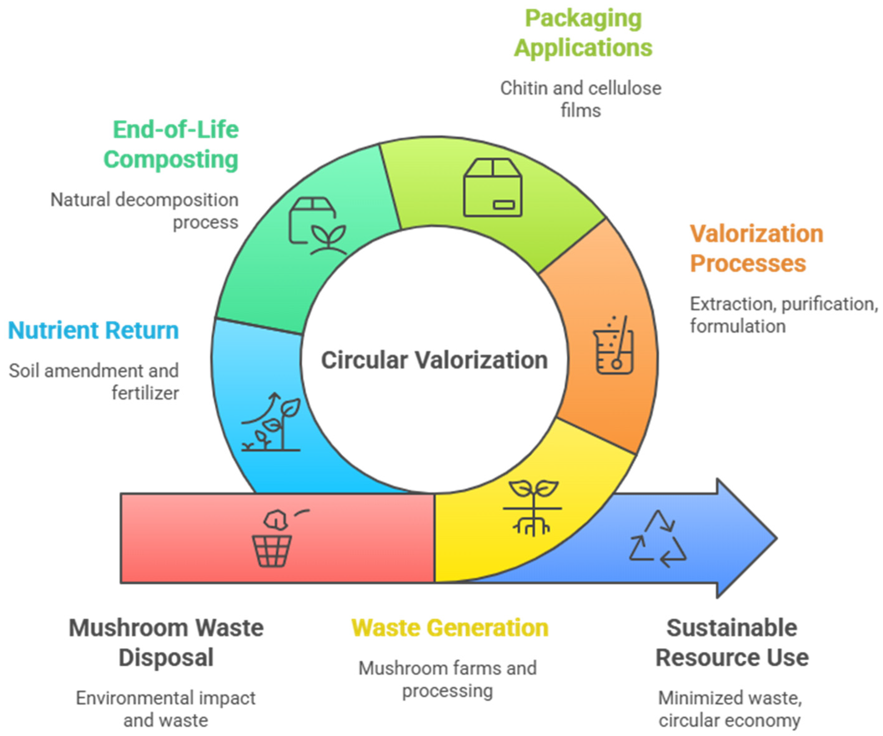 Figure 8. Circular economy pathway for mushroom residue valorization: from residue generation to sustainable food packaging and nutrient recovery.