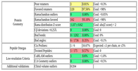 - Williams, C.J.; Headd, J.J.; Moriarty, N.W.; Prisant, M.G.; Videau, L.L.; Deis, L.N.; Verma, V.; Keedy, D.A.; Hintze, B.J.; Chen, V.B.; et al. MolProbity: More and better reference data for improved all-atom structure validation. Protein Sci. 2018, 27, 293–315. [Google Scholar] [CrossRef]