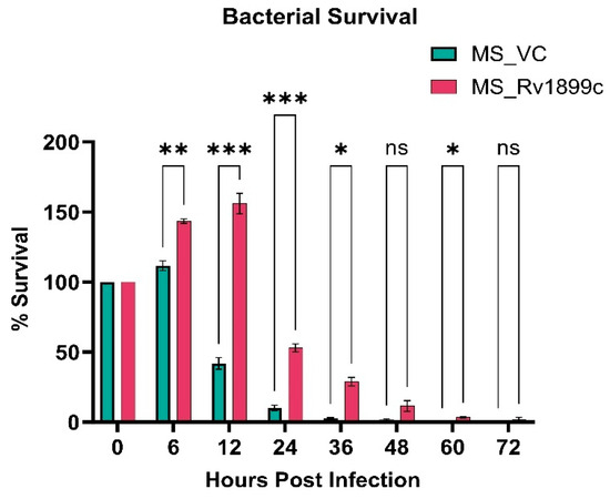 Rv1899c enhances bacterial survival within macrophages. THP-1-derived macrophages were infected with recombinant M. smegmatis-expressing Rv1899c (MS_Rv1899c) or vector control (MS_VC). Intracellular bacterial survival was assessed at the indicated time points post-infection by plating lysed macrophages on 7H10 agar and determining CFUs. Data are represented as percentage survival relative to the 0 h time point. Values represent mean ± SD from three independent experiments. Statistical significance was determined using one-way ANOVA followed by Šidák’s post hoc test. p ≤ 0.05 (*), p ≤ 0.01 (**), p ≤ 0.001 (***), ns: not significant.
