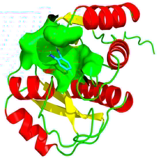 The three-dimensional structure of the uncharacterized protein Rv1899c (UniProt ID: P9WK29) was obtained from the AlphaFold Protein Structure Database [27,28], shown in Figure 1A. From this complete structure containing 359 residues, the macro or A1pp domain, corresponding to residues 179–354, was isolated and extracted; the resulting macrodomain structure is shown in Figure 1B. This procedure was performed using PyMol molecular graphics system, version 2.5.0 [29]. Prior to subsequent analysis, the resulting structure was validated using MolProbity (https://molprobity.biochem.duke.edu/, Accessed on 5 September 2025) [30] and PROCHECK (https://saves.mbi.ucla.edu/, Accessed on 6 September 2025) [23] web server to ensure the structural integrity and stereochemical quality.