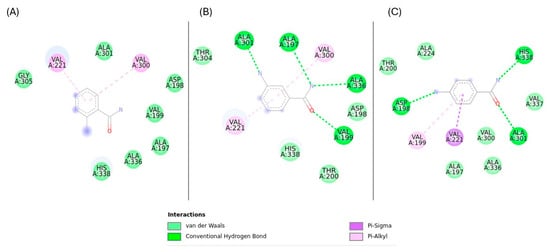 Key molecular interactions of Rv1899c with aminobenzamide isomers (A) 2-aminobenzamide, (B) 3-aminobenzamide, (C) 4-aminobenzamide.