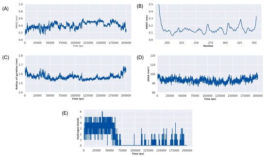 Solvent Accessible Surface Area (SASA), shown in (Figure 10C), and the Radius of Gyration (Rg), shown in (Figure 10D), were calculated to assess the compactness of the protein–ligand complex. The Rg plot depicts consistent values throughout the simulations averaging around 1.58 nm. This observation is further supported by the SASA plot, which remained stable around an average SASA value of 95 nm2. These results suggest that protein–ligand complex remained compact and did not undergo any major unfolding events during the simulation run.