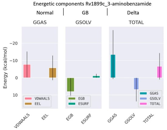Molecular Mechanics/Generalized Born Surface Area (MM/GBSA) method [25] was employed to calculate the binding free energy of the 3-aminobezamide–Rv1899c complex. The gmx_MMPBSA tool, version 1.6.4 [49,50] was employed to estimate the binding free energies, using 4000 frames uniformly sampled at 50 ps intervals from the 200 ns molecular dynamics production trajectory.