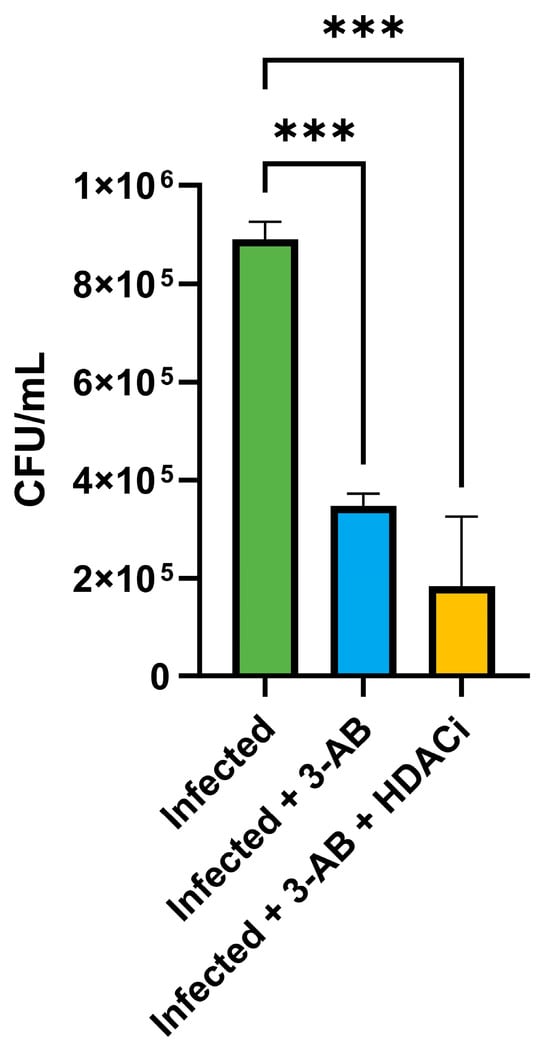The ability of 3-AB to reduce intracellular bacterial survival suggested that it could potentiate the activity of other therapeutic agents. In our previous work, we demonstrated the efficacy of the HDAC inhibitor CI994 in controlling Mycobacterium tuberculosis infection in macrophages [12]. To test for synergy, THP-1-derived macrophages were infected with MS_Rv1899c and subsequently treated with 3-AB in combination with CI994. After 24 h, CFU enumeration revealed a marked reduction in intracellular bacteria, with the combination treatment achieving ~79% killing, compared with ~61% for 3-AB alone (Figure 14).