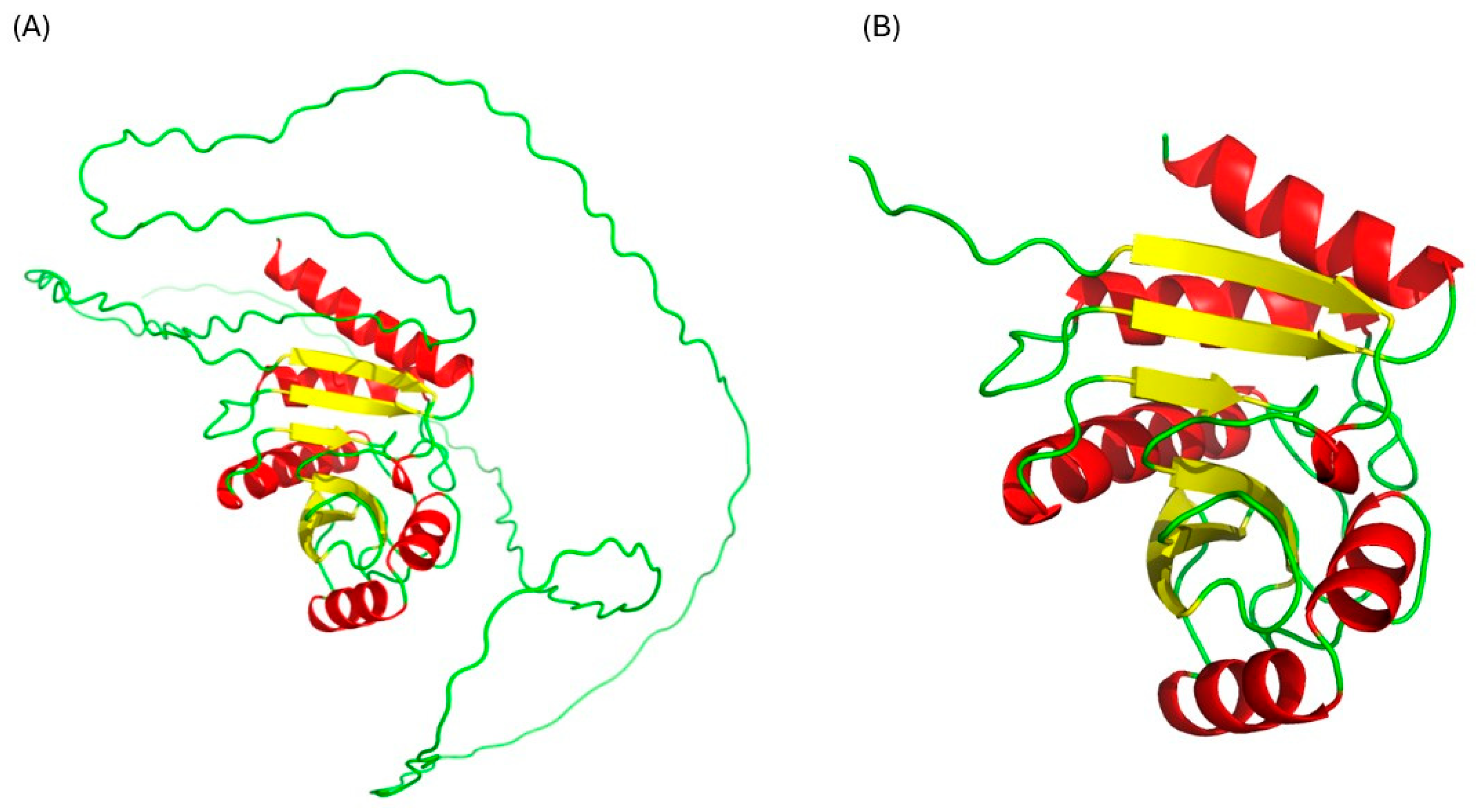 - Jumper, J.; Evans, R.; Pritzel, A.; Green, T.; Figurnov, M.; Ronneberger, O.; Tunyasuvunakool, K.; Bates, R.; Žídek, A.; Potapenko, A.; et al. Highly accurate protein structure prediction with AlphaFold. Nature 2021, 596, 583–589. [Google Scholar] [CrossRef]