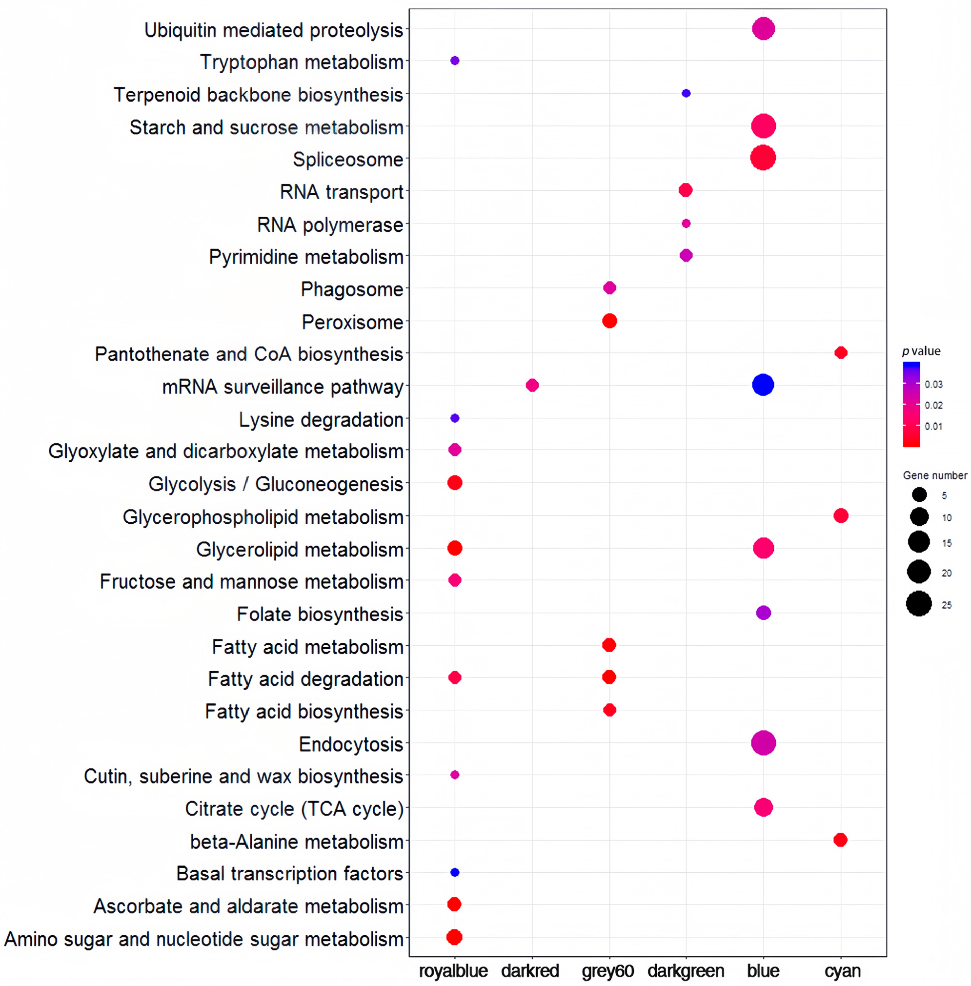 - Grey60 (fertility): Enriched KEGG pathways included fatty acid metabolism-related processes (Figure 4). GO terms for hydrolysis and catabolic processes were enriched (Figure S4B).
