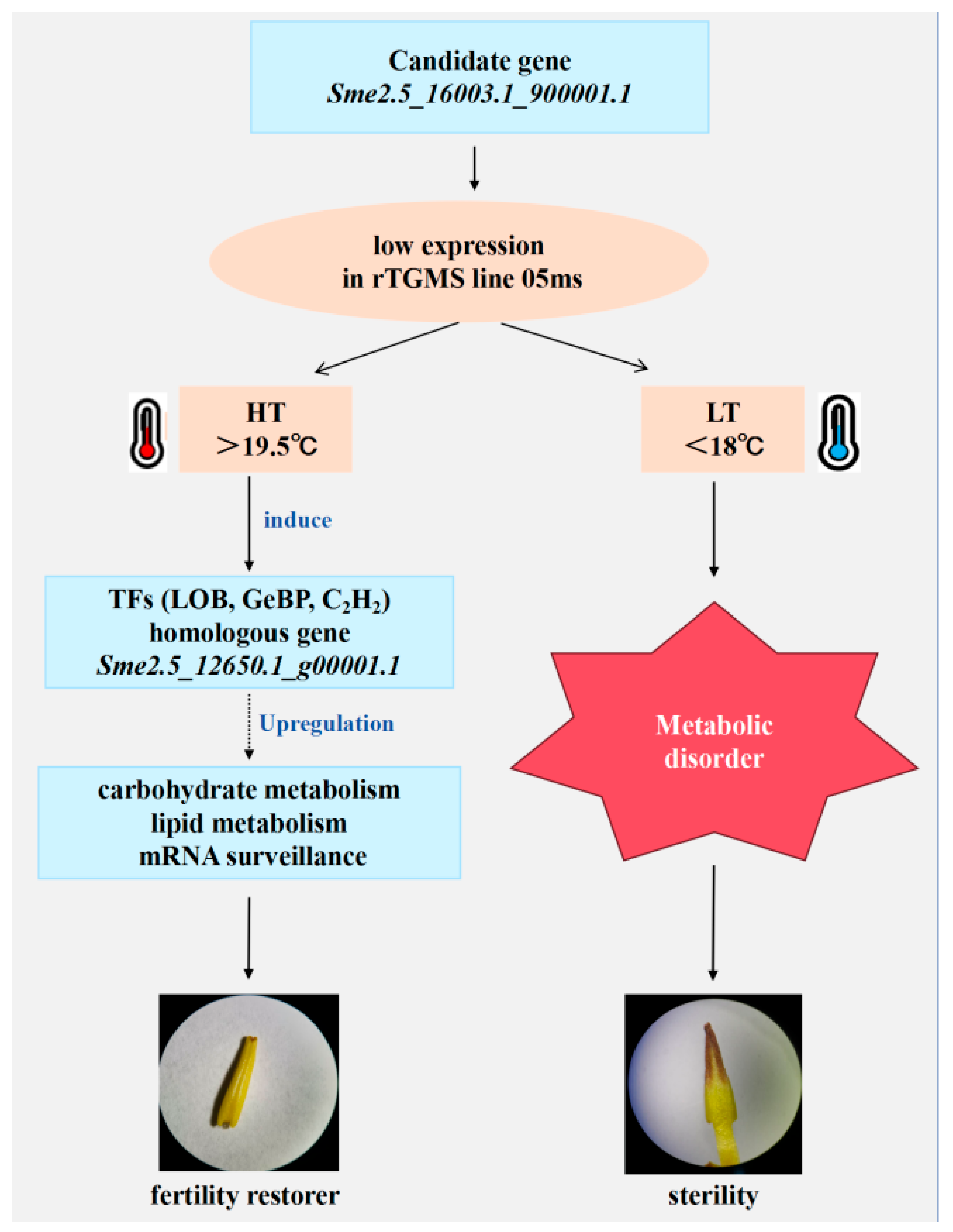 - Li, B.; Chen, X.; Wu, Y.; Gu, A.; Zhang, J.; Luo, S.; Gao, X.; Zhao, J.; Pan, X.; Shen, S. Gene characterization and molecular pathway analysis of reverse thermosensitive genic male sterility in eggplant (Solanum melongena L.). Hortic. Res. 2019, 6, 118. [Google Scholar] [CrossRef]