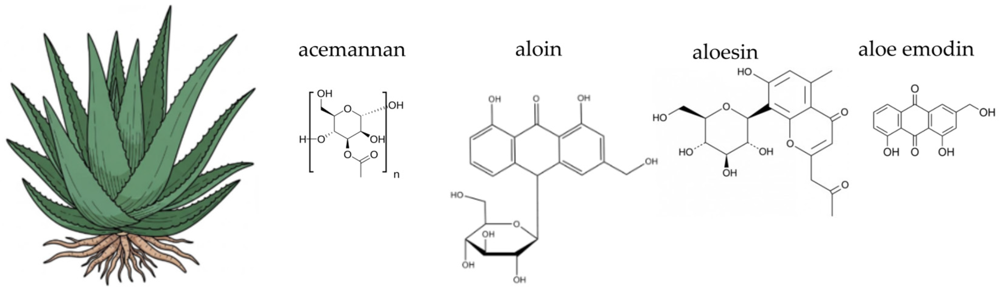 - Abid, A.; Javed, M.; Zafar, S.; Hamdani, S.A.Z.; Shah, S.H.B.U.; Abid, J.; Ahmad, A.M.R. The Green Healer: An Updated Review on the Phytochemical Profile and Therapeutic Potential of Aloe Vera. Front. Nutr. 2025, 12, 1689700. [Google Scholar] [CrossRef]
