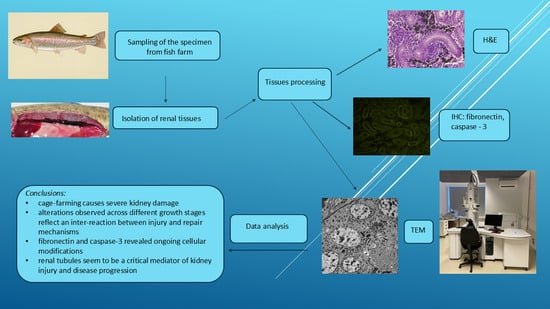 The objective of this study was to investigate and compare renal tissue alterations in cage-farmed rainbow trout across different growth stages, with a particular focus on structural and molecular indicators of kidney stress. By integrating ultrastructural analysis with basic histology techniques and immunohistochemical detection of fibronectin and caspase-3 expression, we aimed to identify core morphological changes and signaling pathways involved in renal pathology. Special emphasis was placed on apoptotic processes, as a critical mechanism of cellular injury, to better understand how intensive aquaculture conditions impact renal integrity over time.
