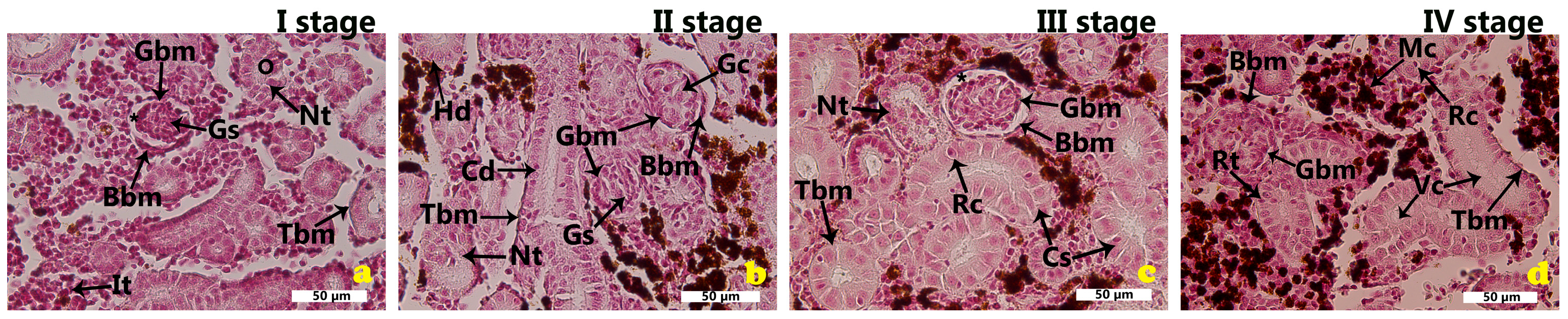 2.1. Morphological Features of the Renal Tissues in the Cage-Farmed Rainbow Trout During Different Growth Stages