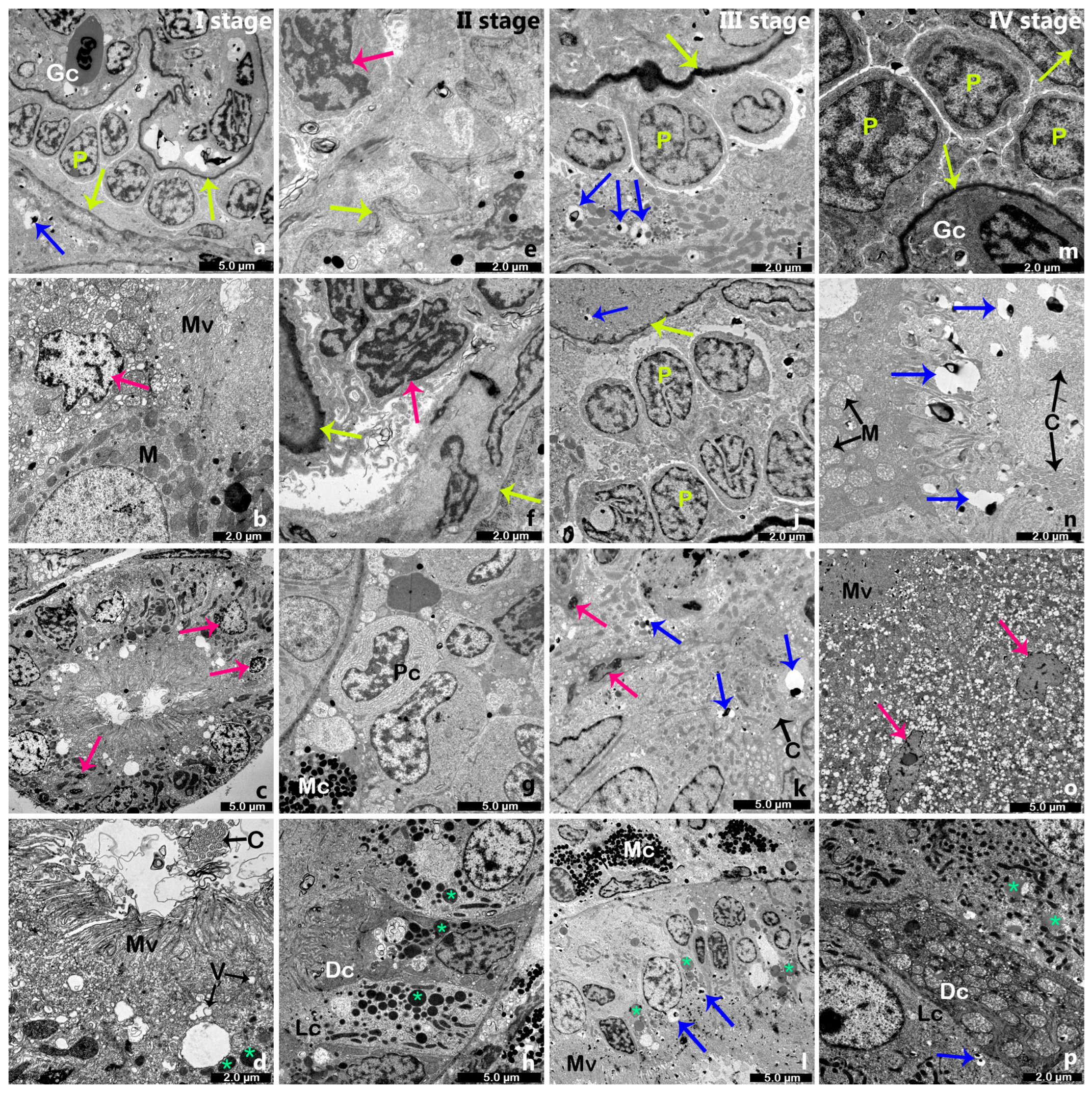 Figure 3. A cross-section throughout the kidney tissue in four growth stages of rainbow trout, Oncorhynchus mykiss (Walbaum, 1792). (ad)—growth stage I; (eh)—growth stage II; (il)—growth stage III; (mp)—growth stage IV. Pink arrows—apoptotic cells and nuclei; blue arrows—apoptotic bodies; yellow arrows—capsular and glomerular basement membranes; Gc—glomerular capillary; P—podocytes; M—mitochondria; C—cilia; Mc—melanomacrophage centers; Pc—plasma-like cell; Mv—microvilli; V—vesicle; L—light cell; Dc—dark cell; asterisk—lipid droplets. Magnification—((a,l,o) ×1200; (b,e,j,p) ×2500; (c) ×800; (d,f,i,n) ×3000; (g,h,k) ×1500; (m) ×4000), TEM.