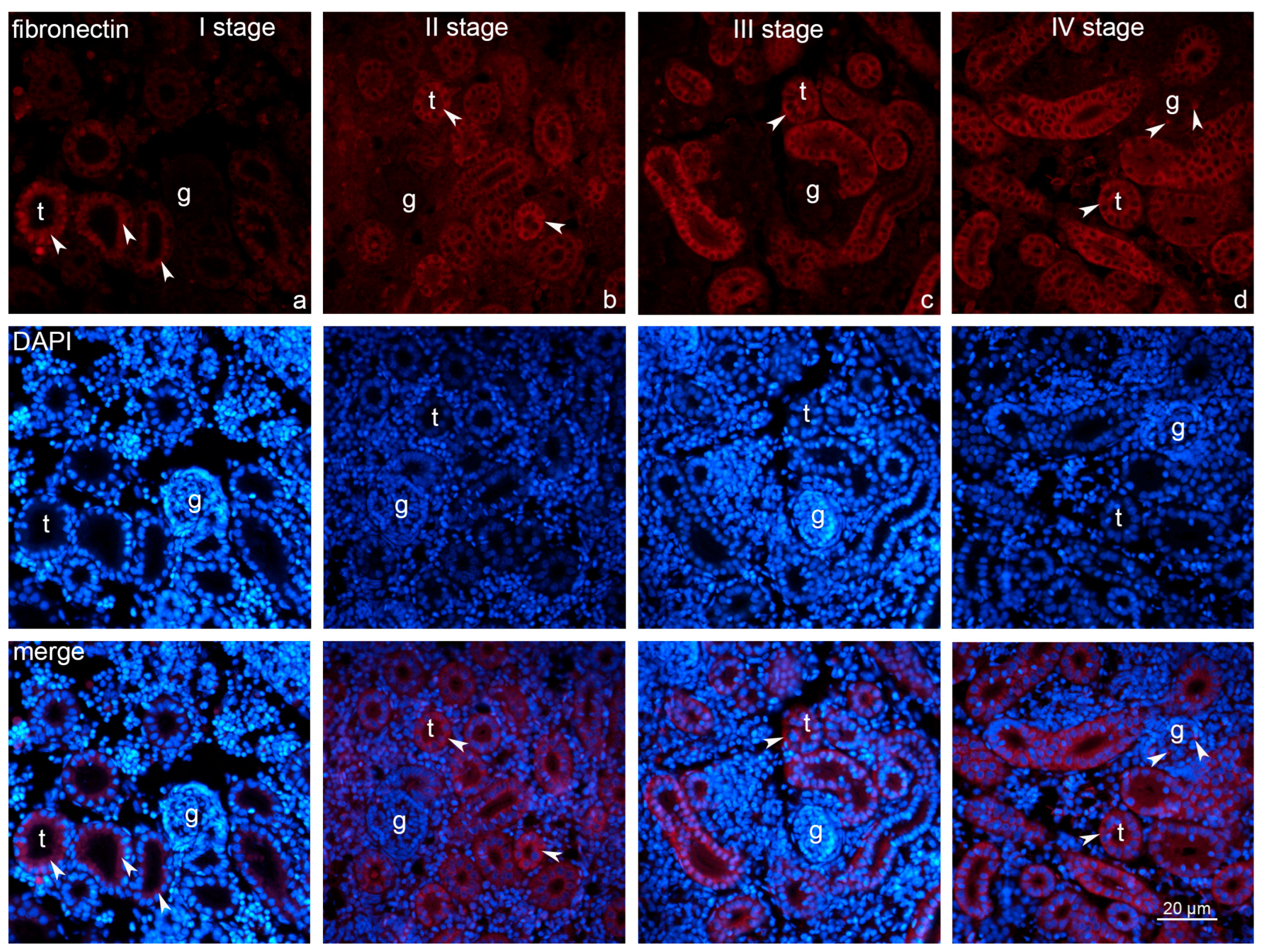 Figure 4. Expression of fibronectin in the renal tissues of the Oncorhynchus mykiss (Walbaum, 1792) within four different growth stages, stage I–IV (ad): g—glomerulus; t—renal tubules; arrowheads—positive labeling of fibronectin. Magnification—40×, scale bar 20 μm.