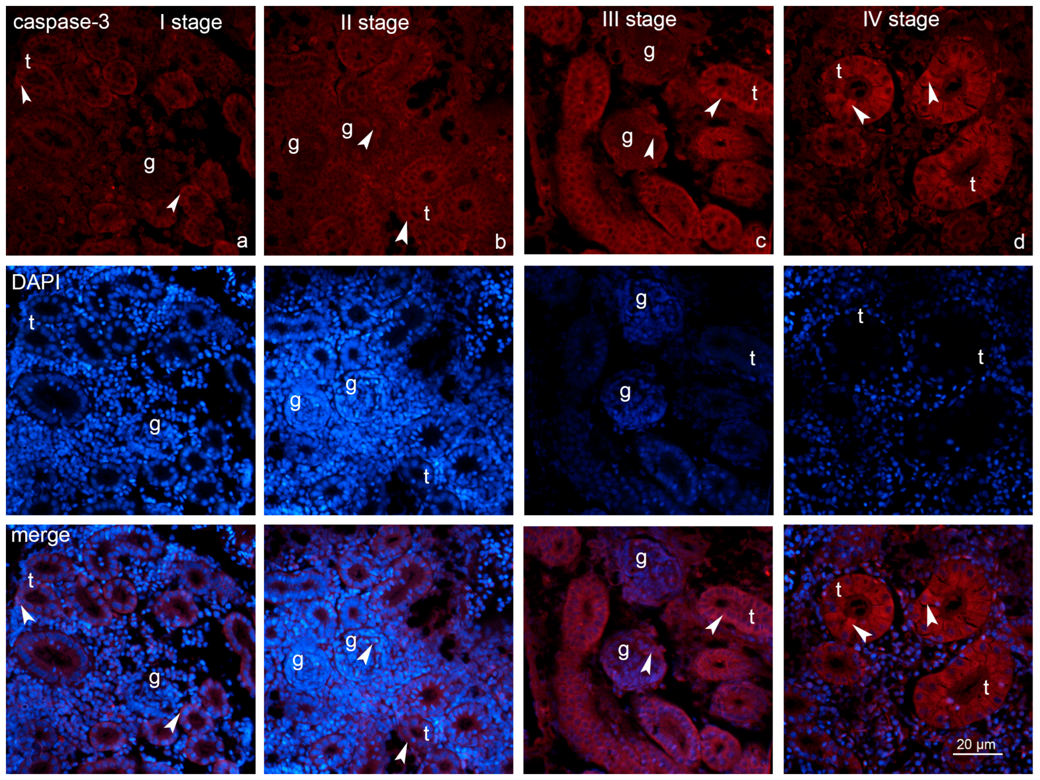 Figure 5. Expression of caspase-3 in the renal tissues of the Oncorhynchus mykiss (Walbaum, 1792) within four different growth stages, stage I–IV (ad): g—glomerulus; t—renal tubules; arrowheads—positive labeling of caspase-3. Magnification—40×, scale bar 20 μm.