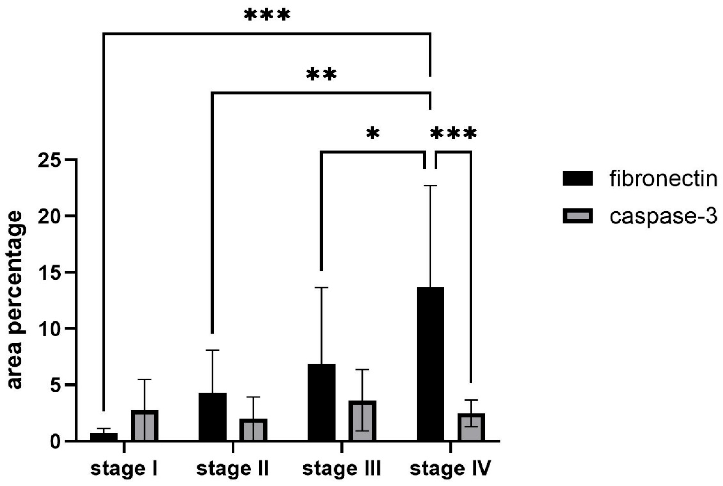In contrast, caspase-3 expression showed no statistically significant variation across the four stages. This indicates that apoptotic activity, as measured by caspase-3, remained relatively constant during kidney maturation and did not follow the same stage-dependent escalation observed for fibronectin. However, a significant difference was observed in stage IV when directly comparing fibronectin and caspase-3 expression (Figure 6, p < 0.001), showing a difference between extracellular matrix accumulation and apoptosis regulation at this advanced stage.