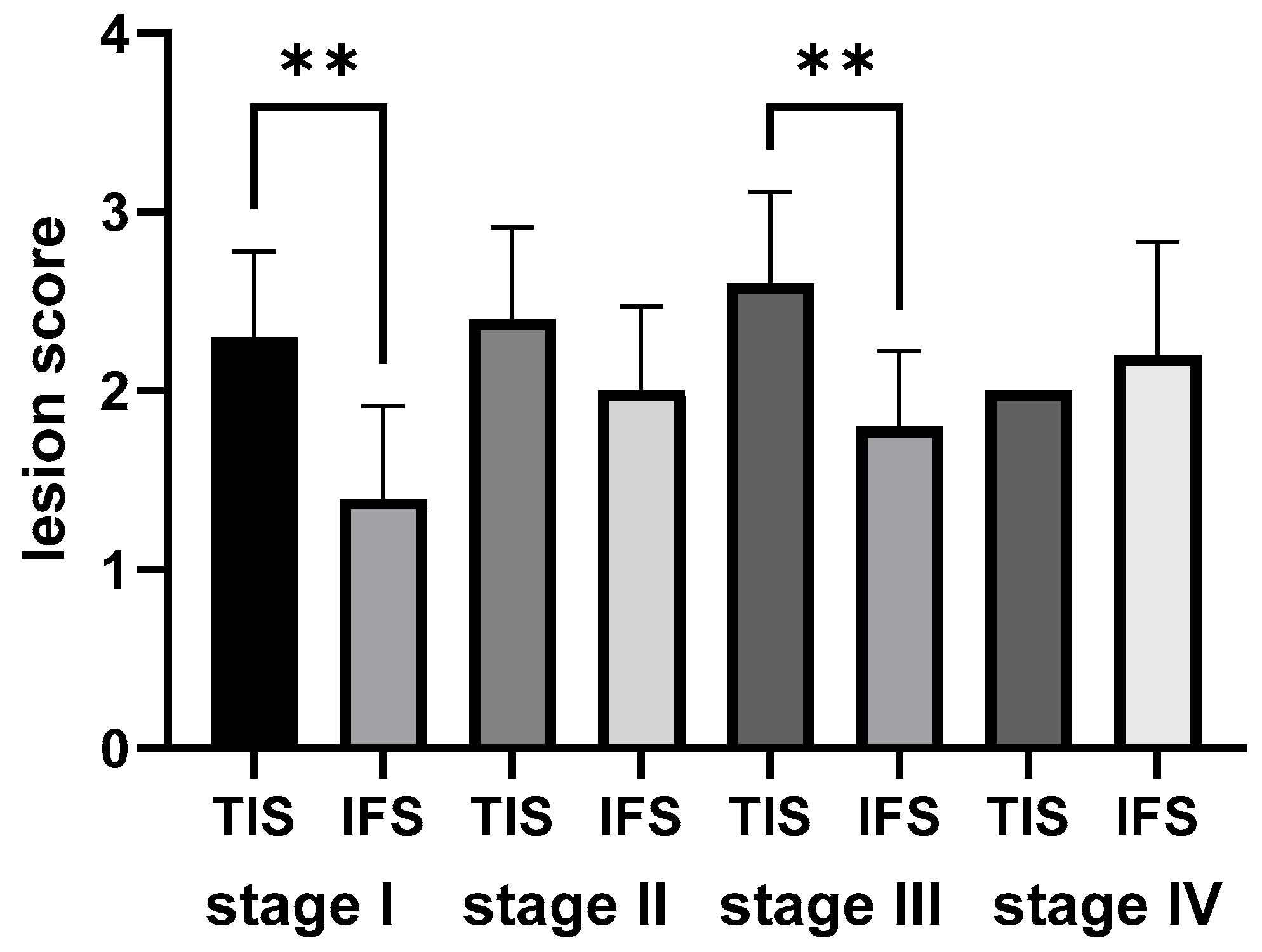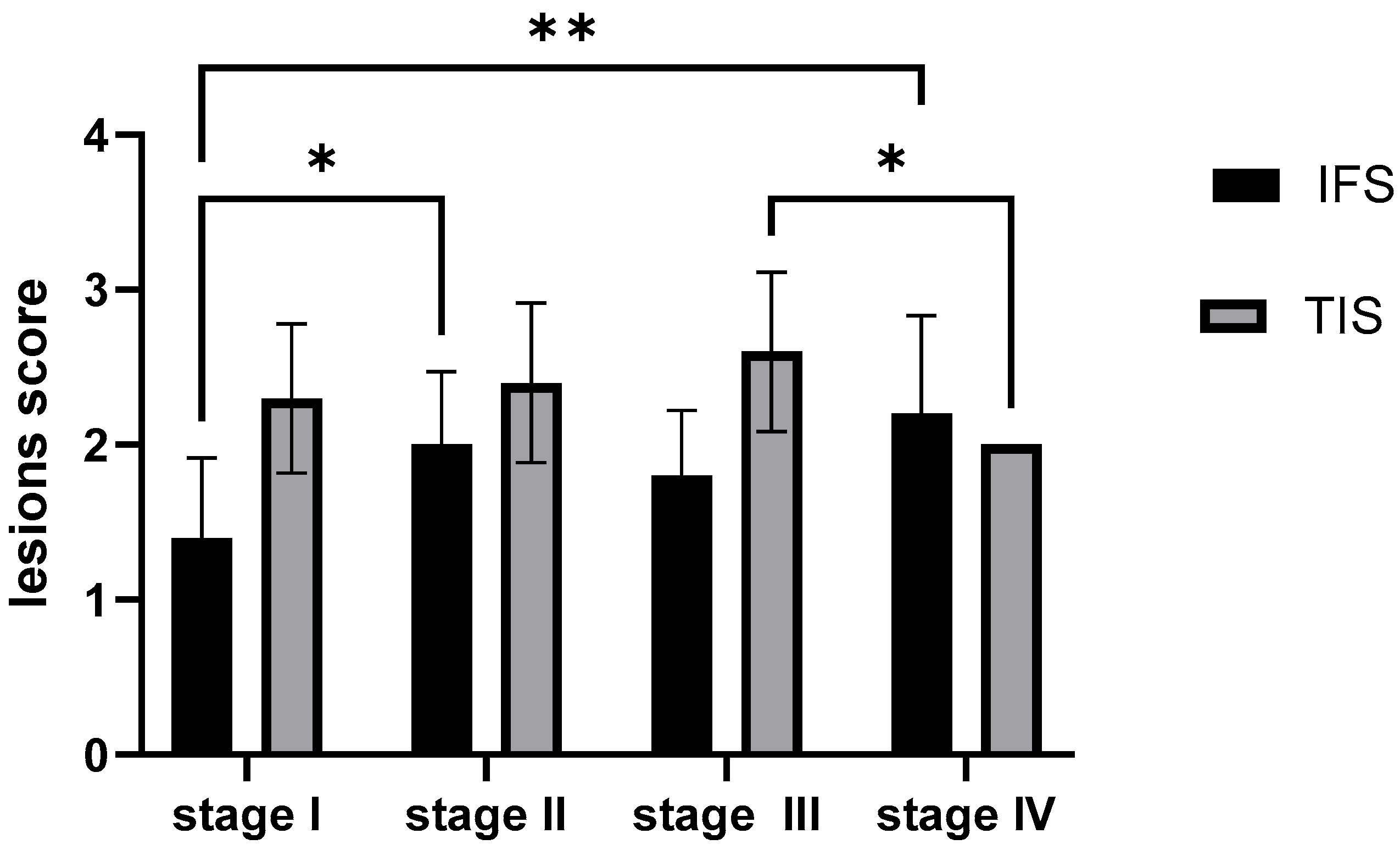 Histopathological examination revealed that tubular injury and interstitial fibrosis were present in the kidneys of trout across all four growth stages. Subsequent comparative analysis was performed to evaluate the dynamic progression of these morphological changes. The results provided insight into the comparative severity of tubular injury (TIS) and fibrosis (IFS) within different growth stages. In the fry stage, stage I, TIS scores were significantly higher than IFS scores (p < 0.05), indicating that tubular injuries were more pronounced than fibrosis. In contrast, no significant difference was observed between TIS and IFS scores in stage II (p > 0.05), suggesting both changes were comparably expressed. The pattern repeated in the later stages; TIS scores were significantly higher than IFS scores in stage III (p < 0.05), while no significant difference was found in stage IV (p > 0.05). The observed pattern indicates that the dominance of tubular injury over fibrosis is not constant during growth. TIS prevails over IFS in some phases (stages I and III), but their severity levels equalize in others (stages II and IV) (Figure 7).