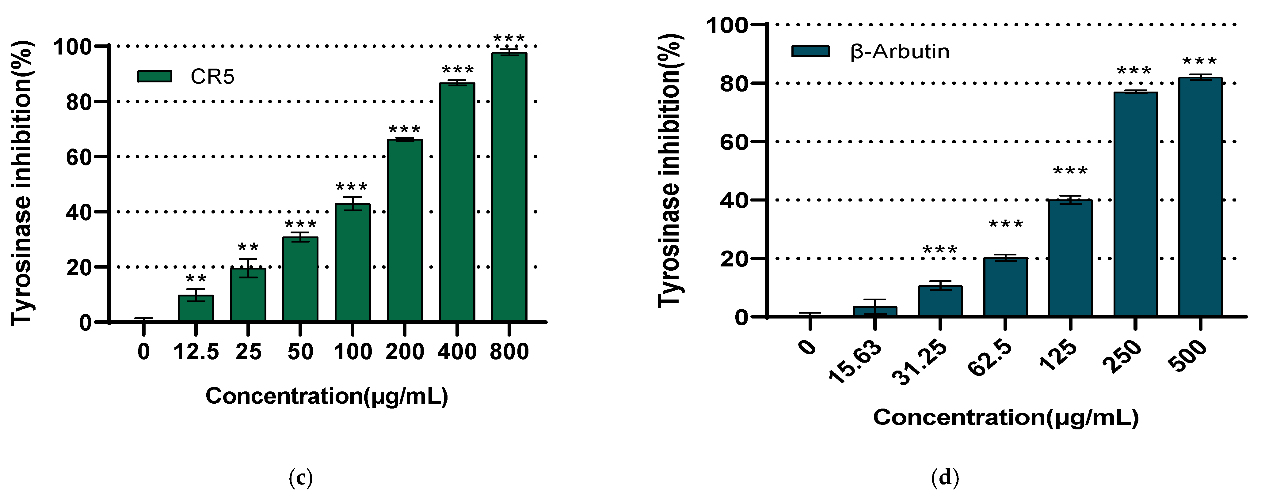 2.9. Molecular Docking of CR5 with Target Enzymes (Tyrosinase and MMP-1)