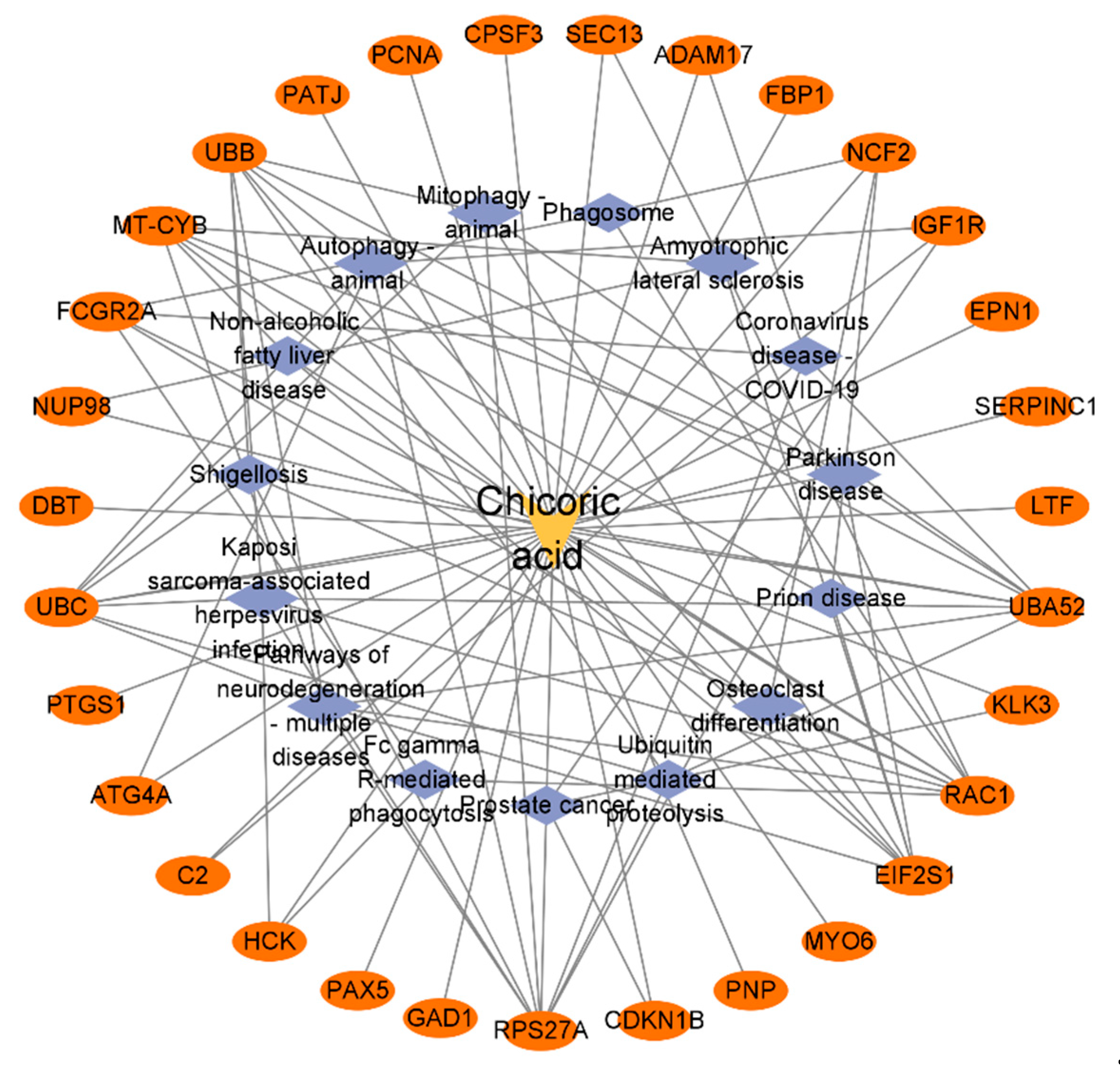 2.5. Construction of the Chicoric Acid-Target-Pathway Network