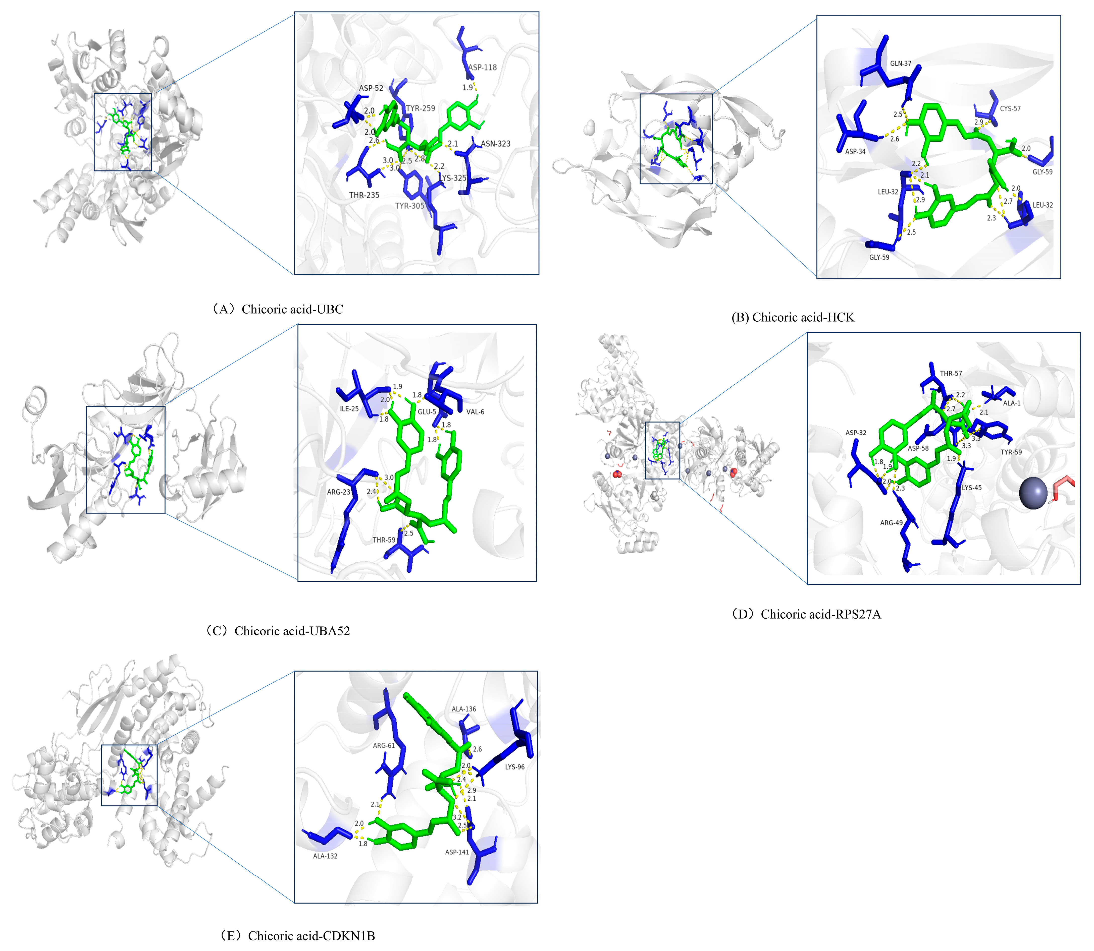 4.7. Molecular Docking Validation of Chicoric Acid with Targets