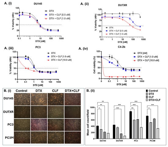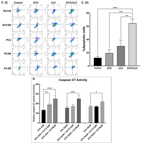 In vitro cell viability assays. (A). Representative dose–response plots showing in vitro cytotoxicity of Clofazimine in combination with Docetaxel (DTX) in the mCRPC cell line pair DU145 and DU-TXR (i,ii), PC3 (iii), and C4-2b (iv). Chemosensitivity assays were performed using Resazurin Assay. (B). Assessment of cellular morphology and cell density: (i) Representative images showing the effect of DTX and CLF drugs on cell count and cell morphology of mCRPC cells. Single-agent IC25 doses of DTX and CLF were used. The images of cells were captured before (0 h) and after (48 h) CLF treatment either as a single agent or in combination. (ii) Microscopy results show significantly higher cell death in combination treatment compared to single-drug treatment for all cell lines; ImageJ data analysis showed a significant difference in cell density for both CLF single-agent and DTX + CLF combination treatments. Results show significantly higher cell death in combination treatment compared to single-drug treatment for mCRPC cell lines (Significant value * p ≤ 0.05). (C). (i) % Apoptotic cells representing the effect of CLF on PCa cell lines as a single agent and in combination with DTX. Cells were treated for 48 h, and then apoptosis was measured using Annexin V-FITC and flow cytometry; (ii) Mean % Apoptotic cells (* p < 0.05, ** p < 0.01, *** p < 0.001, **** p < 0.0001). (D). Representative Caspase 3/7 activity assay plots in DU145 showing increased apoptosis following CLF treatment.