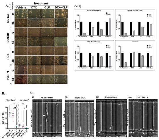 The fabrication of a PDMS-based (Ellsworth Adhesives; Germantown, WI, USA) microchannel assay using standard multilayer photolithography and replica molding has been demonstrated earlier [35,64]. For this study, the PDMS microchannels were coated with Collagen Type I Rat Tail (Corning; Glendale, AZ, USA) at a concentration of 20 μg/mL for one hour before cell seeding. PCa cells were seeded in 6-well plates and treated with 10 μM and 25 μM CLF. Following 24 h incubation, 2 × 106 cells/mL were introduced into the cell seeding inlet line of the microfluidic channel via pressure-driven flow and were allowed to adhere for 30–40 min at 37 °C, 5% CO2. Next, a chemotactic gradient was established to induce cell entry into the microchannels by adding serum-free media to the cell seeding inlet and media supplemented with 10% FBS to the chemoattractant inlet. The devices were placed on an automated Nikon Ti2 Inverted Microscope (Nikon Instruments; Melville, NY, USA) equipped with a Tokai Stage-Top incubator unit, which maintained cells at 37 °C and 5% CO2. Time-lapse Images were captured every 10 min for 8 h with a 10×, /0.45 numerical aperture (NA), Phase Contrast 1 (Ph1) objective. The percentage of cell entry into the microchannels was calculated by dividing the number of cells that entered the microchannels by the total number of cells located within 50 μm of the microchannel entrance.