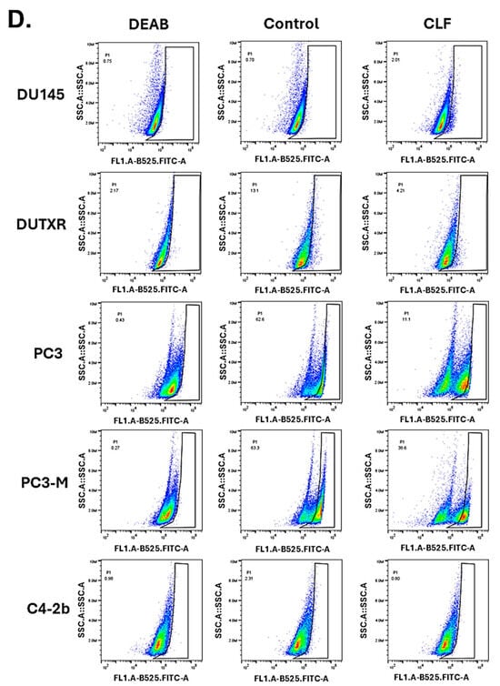 ALDH activity was assessed using the Aldeflour assay kit according to the manufacturer’s instructions (Stem Cell Technologies; Vancouver, BC, Canada). Briefly, 1 × 106 PCa cells were treated with CLF-based regimens for 24 h, harvested, and resuspended in 1 mL Aldefluor assay buffer containing the ALDH substrate BODIPY-aminoacetaldehyde (BAAA). Negative control samples were treated with 5 µL of diethylaminobenzaldehyde (DEAB) as an inhibitor of ALDH1 enzymatic activity. Cells were incubated for 30–45 min at 37 °C, washed twice, and suspended in Aldefluor assay buffer. The brightly fluorescent ALDH+ cells were detected by BD LSR II flow cytometer (BD Biosciences; Franklin Lakes, NJ, USA) and analyzed using FlowJo Software version 10.10 (Ashland, OR, USA).