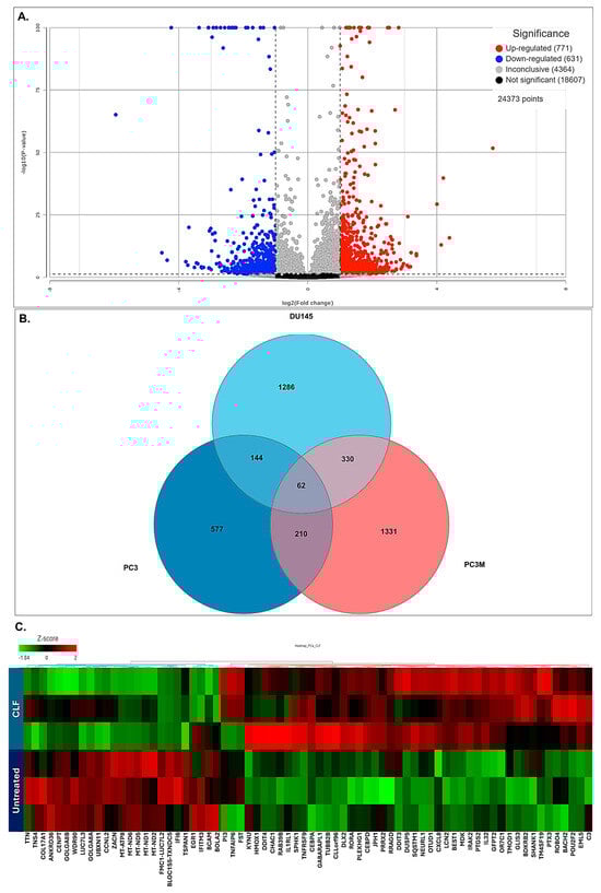 Next, we performed genome-wide transcriptome (next-generation mRNA sequencing or RNAseq) analysis to identify genes that were differentially regulated following CLF treatment. Volcano plots showing these differentially expressed (DE) genes are provided in Figure 3A. Among these, 557 genes were shown to be significantly differentially regulated following CLF treatment (p < 0.05; fold-difference ≠ 1; 260 up-regulated and 297 down-regulated). Of these genes, 497 had an absolute fold-change ≥ 2 (243 Up-regulated and 254 down-regulated). The Venn diagram in Figure 3B shows that among the genes that were differentially regulated following CLF treatment (fold change ≠ 1), 1027 were common between all the mCRPC cell lines (PC3, PC3M, and DU145). Figure 3C shows a heatmap representing the top genes that were significantly differentially expressed between CLF-treated vs. untreated controls. Supplementary Table S1 lists the top coding genes with log2ratio (CLF vs. treatment) > |2|. The top differentially expressed genes in the DUTXR cell line are listed in Supplementary Table S2.