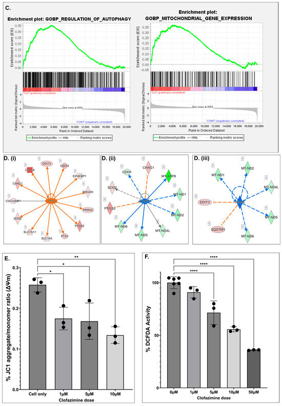 Pathway analysis based on differentially expressed genes. (A) Graphical Summary of Ingenuity Pathway Analysis (IPA); Orange—predicted activation, Blue—predicted inhibition. (B) (i,ii) Top Canonical Pathways predicted using IPA (B-H > 1.3; |z| > 2) and (C) GSEA results showing top dysregulated pathways. (D) (i–iii)Top predicted Upstream regulators (p-value of overlap < 0.05; Predicted activation z-score & expression fold change > |1.5|). (E,F) CLF affects mitochondrial membrane potential (MMP) and intracellular reactive oxygen species (ROS) generation in PCa cells. Representative figures showing the DU145 cell line. (E). Mitochondrial membrane potential (MMP): JC-1 (Sigma), a cationic carbocyanine dye that accumulates in mitochondria, was used to assess Mitochondrial membrane potential (∆ΨM). The JC-1 aggregate (healthy mitochondria) vs. monomer (depolarized mitochondria) ratio is a measure of (∆ΨM). (F) Reactive Oxygen Species (ROS) generation: DCFDA (Sigma) was used to measure intracellular ROS production by flow cytometry. DCFDA shows fluorescence when oxidized (* p < 0.05, ** p < 0.01, **** p < 0.0001).
