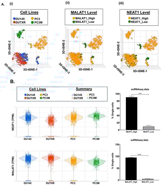 Figure 5(Ai) displays T-distributed stochastic neighbor embedding (t-SNE) clusters generated from baseline (untreated) scRNAseq data on individual single cells in mCRPC cell lines (~3500 cells). Each dot represents a single cell. We have earlier demonstrated that ARlow cells (primarily belonging to the mCRPC subtype) show higher expression of several mesenchymal gene signatures involved in Epithelial–mesenchymal transition (EMT), including Vimentin, N-cadherin (CDH2), Fibronectin (FN1), S100A4, Snail (SNAI1), Slug (SNAI2), CDH11, TWIST1, and ZEB1, as well as the upregulation of cancer stemness-related markers like Urokinase-type plasminogen activator (PLAU), Urokinase-type plasminogen activator receptor (PLAUR), and CD44, which were further up-regulated in the taxane-sensitive mCRPC cell line DU145-TXR, in addition to the drug resistance markers CDK1 and CXCL8 [24]. Here, through investigation of the transcriptome profiles of non-coding RNAs in individual cells within mCRPC cell lines, we observed a significantly large proportion (>90%) of subclones with high expression (log2(CPM) > 1) of the top non-coding RNAs NEAT1 and MALAT1/NEAT2 among all 4 cell lines (Figure 5(Aii, iii),B).
