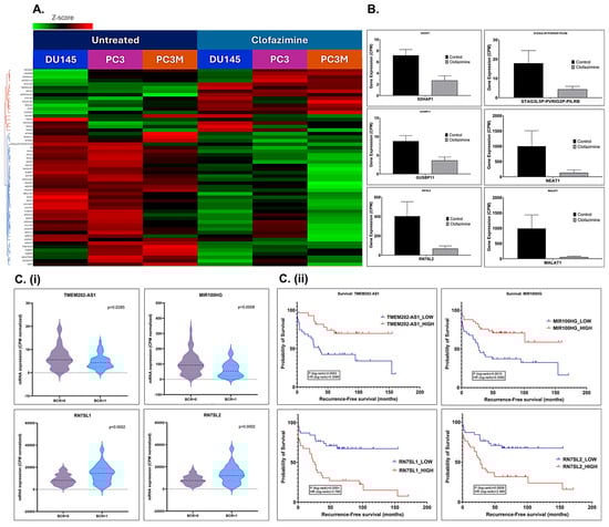 Further in silico analysis of the non-coding gene signature using The Cancer Genome Atlas (TCGA)’s prostate adenocarcinoma (PRAD) Gene expression profiling (GEP) dataset showed that several non-coding RNAs that were significantly differentially dysregulated following CLF treatment were also significantly associated with disease-free survival (Kaplan–Meier curves; Figure 6D), with Hazards Ratios > 2 and p < 0.05. Thus, these biomarkers may serve as additional cues to the mechanism of action of Clofazimine, particularly its efficacy in metastatic/aggressive PCa.