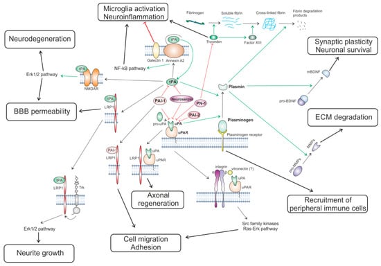 One of the most established functions of the PA system, along with fibrinolysis, is the regulation of extracellular matrix (ECM) metabolism. ECM is a complex structure consisting of multiple structural and non-structural proteins that function as a supporting environment for neurons, glia, and endothelial cells, and also participate in cell-surface and cell–cell interactions, regulation of cell signaling, and ultimately provide an active environment for cell differentiation, migration, axonal growth and repair, and synaptic plasticity [,].