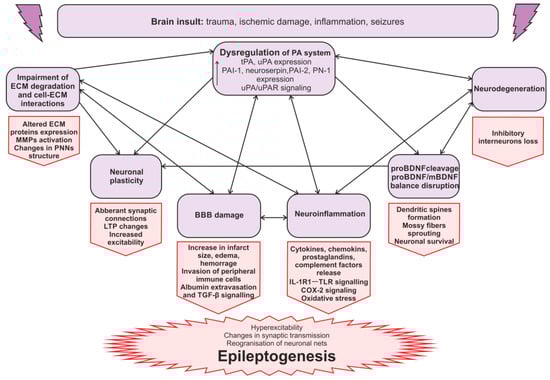 Studies on rodent models of seizures and epileptogenesis that reproduce features of human epilepsy have provided data on pathogenic mechanisms and helped identify therapeutic targets [,]. The broad spectrum of cellular and molecular processes involved includes neurodegeneration and neurogenesis, changes in the function of neuroglia, neurons, and the cerebral vascular system leading to BBB damage, neuroinflammation, axonal sprouting and damage, and alterations in the extracellular matrix [,,]. At the same time, an epileptic seizure can itself act as a trigger, causing glutamatergic toxicity and inducing a cascade of events leading to further progression of neuronal excitability []. The PA system is involved in the regulation of many of these processes in the brain. A triggering event can induce profound changes in the expression of the components of the PA system.