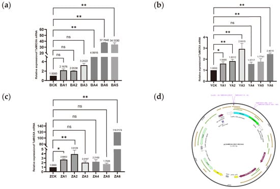 (a) The expression level of TaMIOXA in the Bainong 207 overexpression strain. (b) The expression level of TaMIOXA in the Yangmai 13 overexpression strain. (c) The expression level of TaMIOXA in the Zhengmai 7698 overexpression strain. Statistical analyses were performed using one-way analysis of variance (ANOVA). ** p < 0.01, * p < 0.05; ns, not significant. Data are presented as mean ± SD; all experiments included n = 3 biological replicates. (d) pCAMBIA1302-TaMIOXA plasmid map.