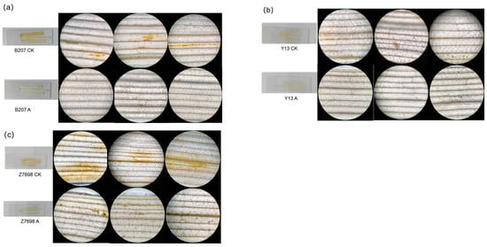 Wheat plants in the overexpression groups (B207 A, Y13 A, Z7698 A) and the control groups (B207 CK, Y13 CK, Z7698 CK) were cultured in a light incubator for 10 weeks at 22 °C and 85% relative humidity, under a 16 h light/8 h dark photoperiod. The overexpression and control groups were simultaneously subjected to drought and high-temperature stress for 7 days, with conditions of 40 °C and 50% relative humidity for 14 h during the day, and 25 °C and 50% relative humidity for 8 h at night. After drought and high-temperature stress, the plants were re-watered and allowed to recover for 10 days. The above-ground parts of wheat were harvested, rapidly frozen in liquid nitrogen, and then stored at −80 °C for subsequent experiments. We quantified malondialdehyde (MDA) using the thiobarbituric acid (TBA) assay []. Hydrogen peroxide content was measured using the ammonium molybdate colorimetric method []; glucuronic acid was determined with high-performance liquid chromatography (HPLC); catalase (CAT) activity was assessed via UV spectrophotometry []; peroxidase (POD) activity was assessed using the guaiacol oxidation assay []; and superoxide dismutase (SOD) activity was assessed using the nitroblue tetrazolium (NBT) reduction assay [], respectively.
