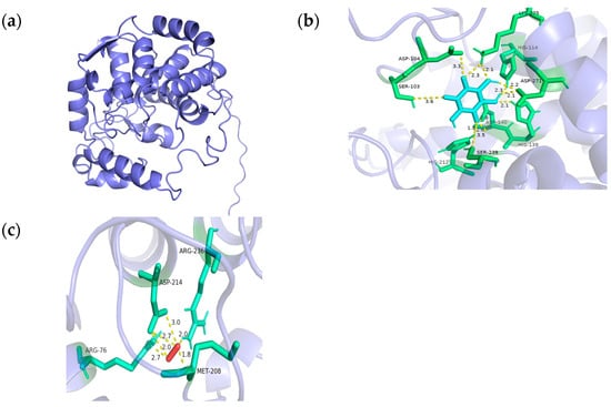 Molecular docking results of the TaMIOXA protein. (a) Protein modeling results of myo-inositol oxygenase generated by AlphaFold3. (b) The hydrogen bonding network from the docking of myo-inositol oxygenase with inositol. (c) The hydrogen bonding network from the docking of myo-inositol oxygenase with hydrogen peroxide.