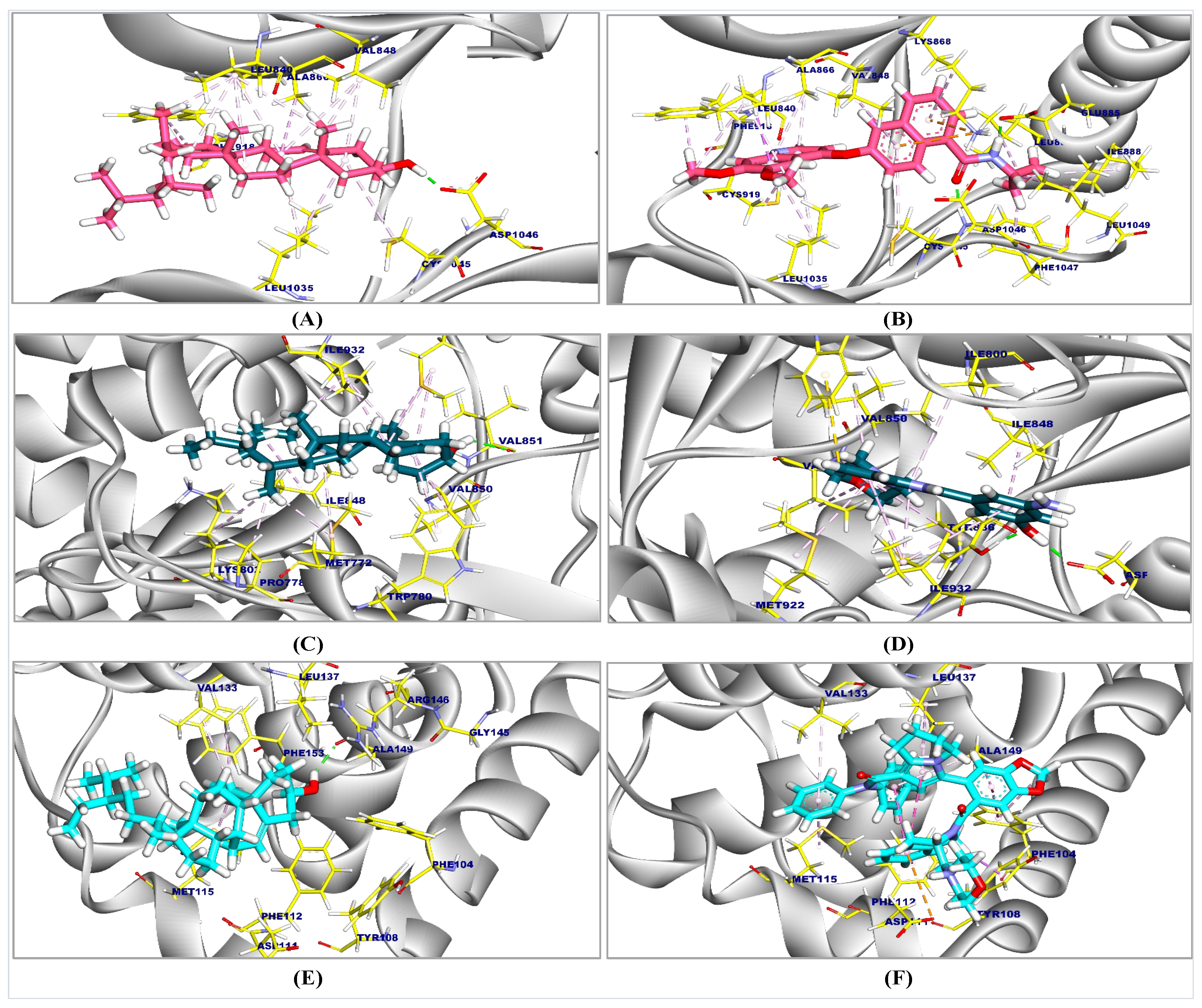 Figure 1. 3D figure of the proposed binding mode of β-Sit against VEGFR-2, PI3K, and BCL2: (A) β-Sit against VEGFR-2, (B) Co-crystallized ligand complexed with VEGFR-2, (C) β-Sit against PI3K, (D) Co-crystallized ligand complexed with PI3K, (E) β-Sit against BCL2, and (F) Co-crystallized ligand complexed with BCL2.