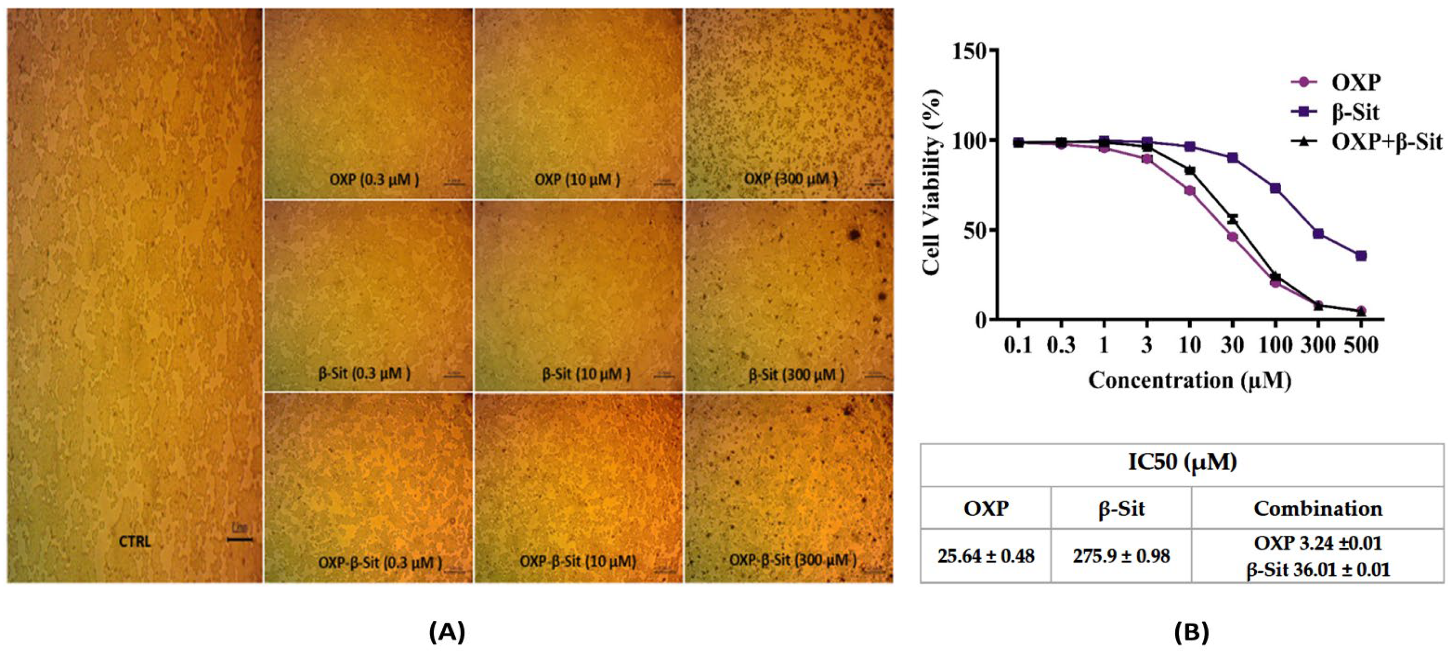 Figure 2. MTT cytotoxicity analysis on COLO-205 cells: (A) Depictive images of the MTT assay showing the effects of OXP, β-Sit, and their combination on cell viability at concentrations of 0.3, 10, and 300 µM. Scale bar: 0.2 mm. (B) The IC50 values for each treatment at various concentrations (0.1, 0.3, 1, 3, 10, 30, 100, 300, and 500 µM). Data represent the mean ± SD (n = 3). Control (CTRL), Oxaliplatin (OXP), β-sitosterol (β-Sit).