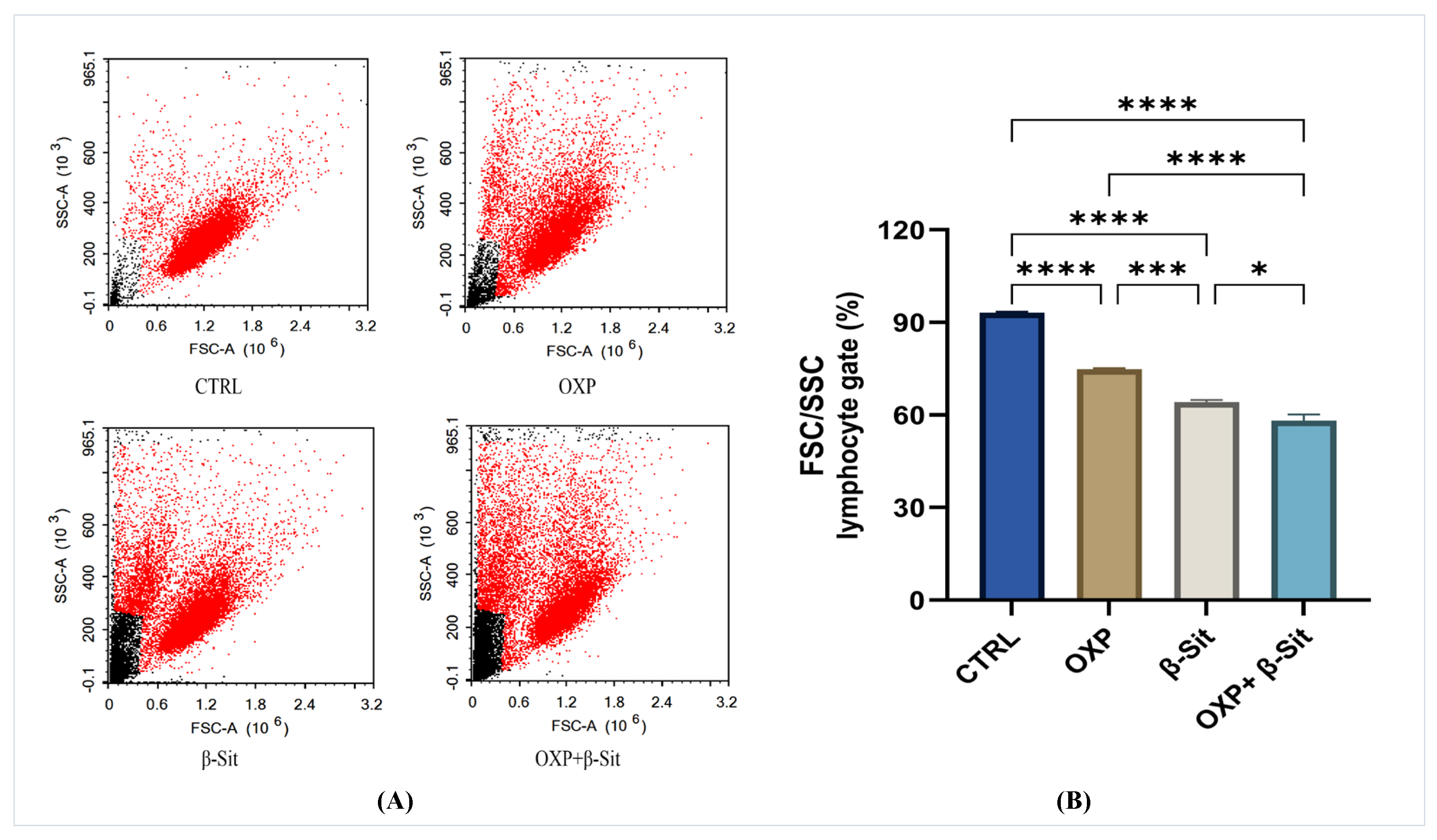 Figure 4. Flow cytometric analysis of FSC/SSC in COLO-205 cells after treatment with OXP, β-Sit, and OXP + β-Sit: (A) Histograms depicting variations in cell population, (B) Quantitative analysis of FSC/SSC. Data are presented as mean ± SEM (n = 3). Data analysis was performed using one-way ANOVA and Tukey’s post hoc test. **** p < 0.0001, *** p < 0.001, * p < 0.05.