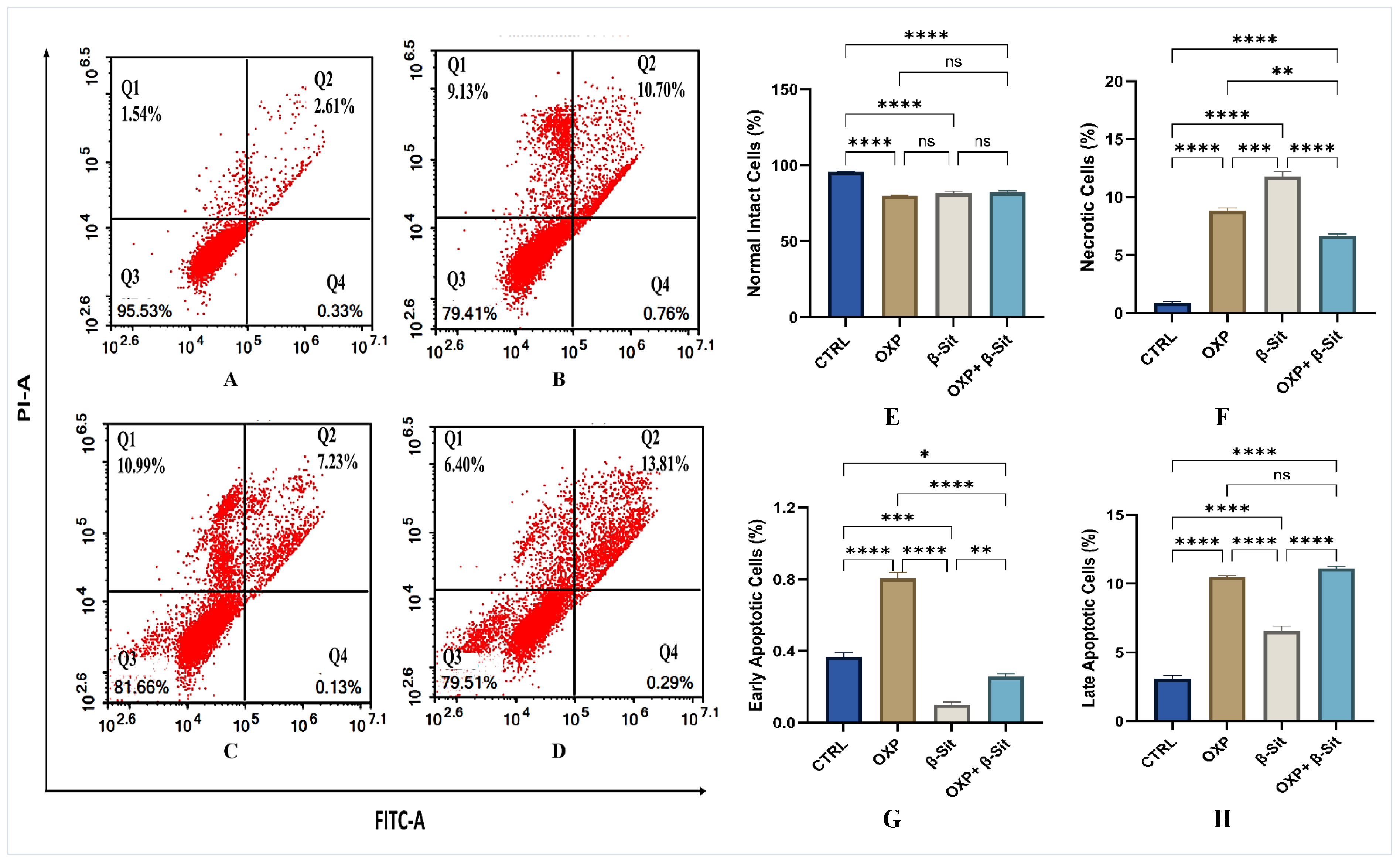 Figure 5. Annexin V–FITC/PI flow cytometric analysis of apoptosis in COLO-205 cells following different treatments: (AD) Representative FITC-A/PI-A: (A) CTR, (B) OXP, (C) β-Sit, and (D) OXP + β-Sit treatments. The four quadrants represent: Q1 (necrotic cells), Q2 (late apoptotic cells), Q3 (normal intact cells), and Q4 (early apoptotic cells). (EH) Quantitative evaluation of apoptosis: (E) normal intact cells, (F) necrotic cells, (G) early apoptotic cells, and (H) late apoptotic cells. Data are presented as mean ± SEM (n = 3). Statistical analysis was examined utilizing one-way ANOVA, succeeded by Tukey’s post hoc test. The significance levels are denoted as follows: **** p < 0.0001, *** p < 0.001, ** p < 0.01, and * p < 0.05. ns = not significant.
