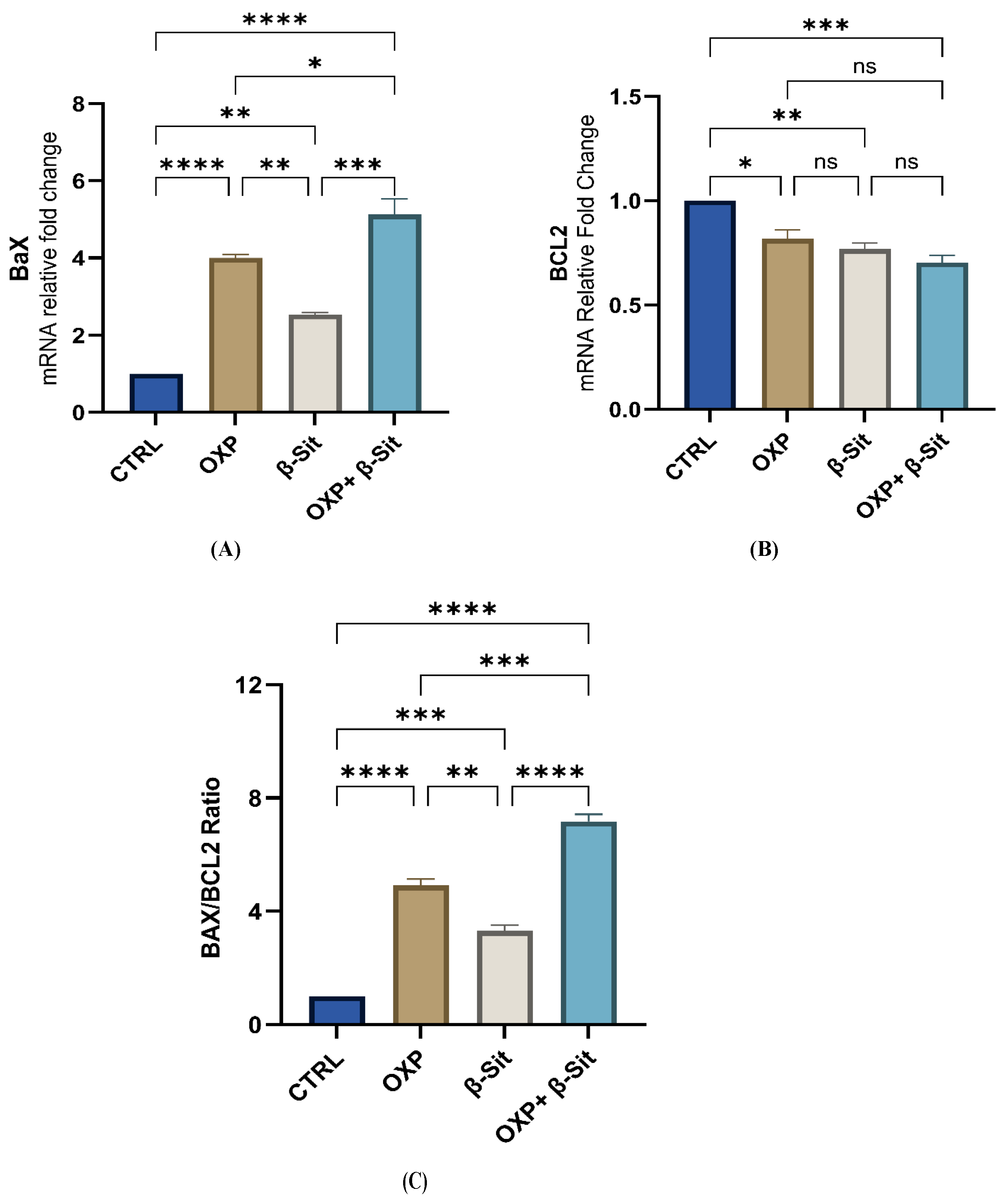 Figure 6. Effect of OXP, β-Sit, and their combination on (A) BAX, (B) BCL2, and (C) BAX/BCL2 ratio in COLO-205 cells. Data are presented as mean ± SEM (n = 3). Statistical analysis was performed by one-way ANOVA and then Tukey’s post hoc test. ns = not significant, * p < 0.05, ** p < 0.01, *** p < 0.001, **** p < 0.0001.