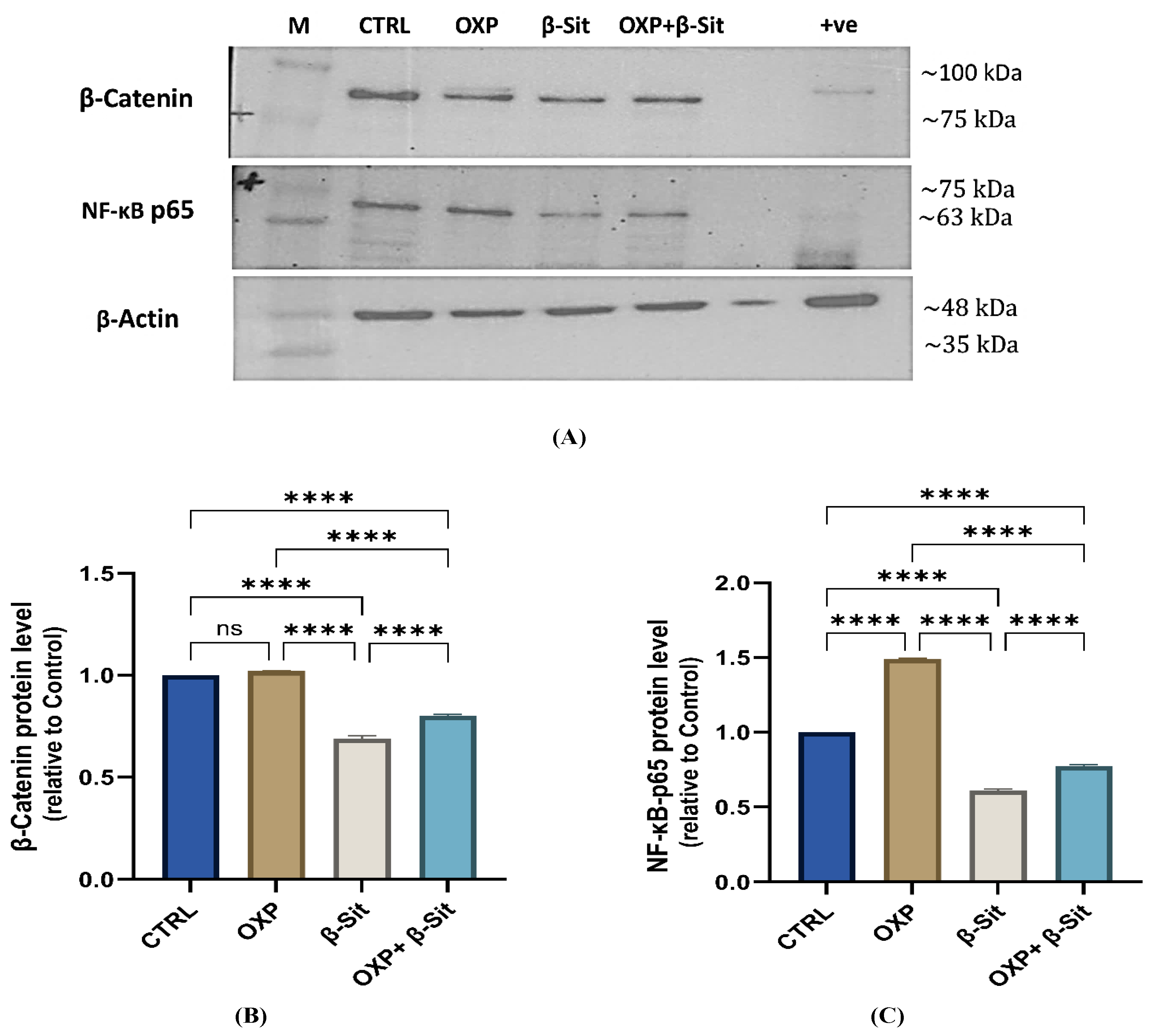 The Western blot results in Figure 8A,B demonstrated that OXP elevated β-catenin expression with no statistical significance (~1.02-fold, p = 0.273), while β-Sit significantly reduced β-catenin levels (~0.69-fold, p < 0.0001), and the combined treatment resulted in moderate suppression (~0.80-fold, p < 0.0001) relative to CTRL. Moreover, OXP treatment increased NF-κB-p65 expression by 1.49-fold (p < 0.0001 compared to CTRL), signifying the activation of a survival mechanism. In contrast, β-Sit markedly reduced NF-κB-p65 levels (0.61-fold, p < 0.0001), while the combination of OXP and β-Sit resulted in intermediate expression (0.77-fold, p < 0.0001) relative to CTRL. Furthermore, β-Sit, either alone or combined with OXP, substantially diminished the levels of β-catenin and NF-κB-p65 in comparison to OXP alone (p < 0.0001), indicating that β-Sit mitigated the OXP-induced increase of β-catenin and NF-κB-p65. This aligns with prior studies indicating that β-Sit can downregulate β-catenin expression [48,49] and promote apoptosis in CC cells by targeting β-catenin [50]. Moreover, β-Sit inhibited the NF-κB pathway, which often allows tumor cells to evade apoptosis by upregulating pro-survival genes [32]. Furthermore, Shen et al. [51] revealed that β-Sit therapy concurrently inhibits NF-κB-p65 and β-catenin signaling. The data suggest that β-Sit may enhance OXP efficacy through improving the downregulation of Wnt/β-catenin signaling and suppressing NF-κB-mediated resistance pathways.