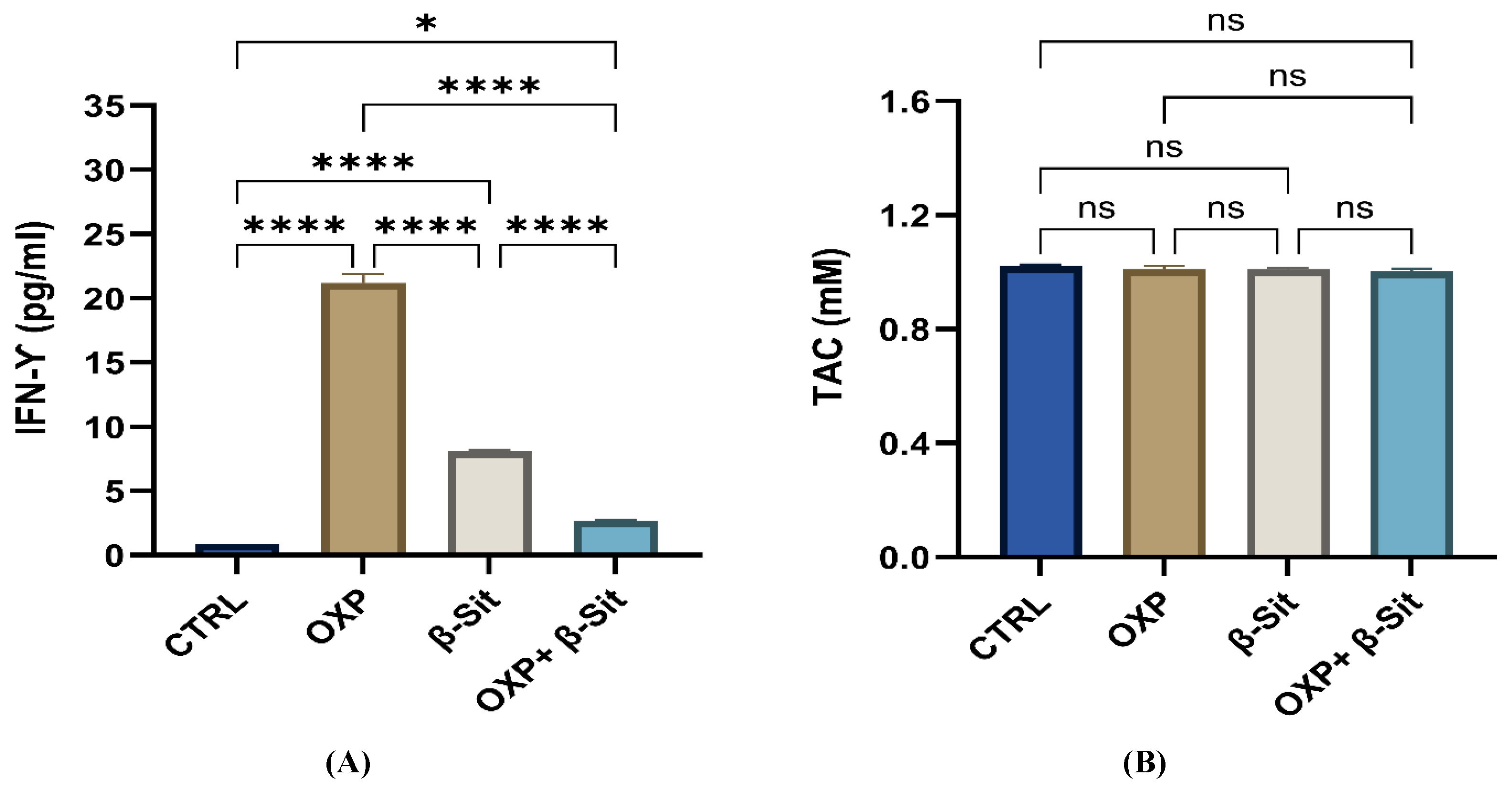 Figure 9. Effects of OXP, β-Sit, and OXP + β-Sit on (A) IFN-γ level (pg/mL) and (B) TAC concentration (mM). Data are presented as mean ± SEM (n = 3). Statistical analysis was performed using one-way ANOVA/Tukey’s post hoc test. * p < 0.05, **** p < 0.0001, ns = not significant.