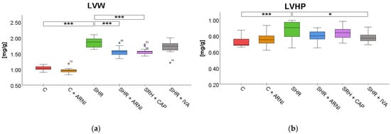 Effects of ARNI, captopril, and ivabradine on (a) left ventricular weight (LVW) and (b) left ventricular hydroxyproline concentration (LVHP) in Wistar control rats (C) and spontaneously hypertensive rats (SHRs) after six weeks of treatment. Data are presented as means ± SD. One-way ANOVA was performed, followed by the Bonferroni post hoc test; * Significance at p < 0.05; *** Significance at p < 0.001. Abbreviations: ARNI—sacubitril/valsartan; CAP—captopril; and IVA—ivabradine.
