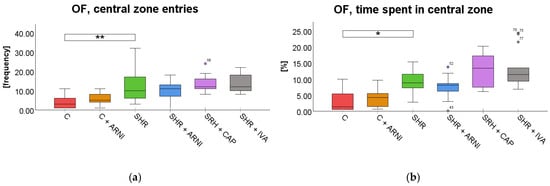 Effect of ARNI, captopril, and ivabradine on anxiety-like behavior in Wistar control rats (C) and spontaneously hypertensive rats (SHRs) in the open field test (OF): (a) Frequency of central zone entries in the OF; and (b) percentage of time spent in the central zone in the OF. Data are presented as means ± SD. One-way ANOVA was performed, followed by the Bonferroni post hoc test; * Significance at p < 0.05; ** Significance at p < 0.01. Abbreviations: ARNI—sacubitril/valsartan; IVA—ivabradine; and CAP—captopril.