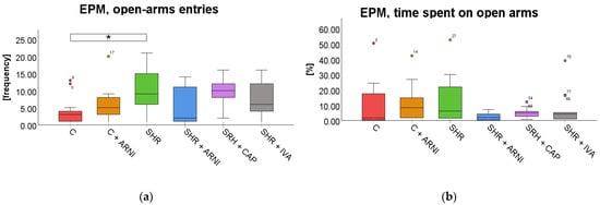 Effect of ARNI, captopril, and ivabradine on anxiety-like behavior in Wistar control rats (C) and spontaneously hypertensive rats (SHRs) in the elevated plus maze test (EPM): (a) Frequency of open-arm entries in the EPM; (b) and percentage of time spent on open arms in the EPM. Data are presented as means ± SD. One-way ANOVA was performed, followed by the Bonferroni post hoc test; * Significance at p < 0.05. Abbreviations: ARNI—sacubitril/valsartan; IVA—ivabradine; and CAP—captopril.