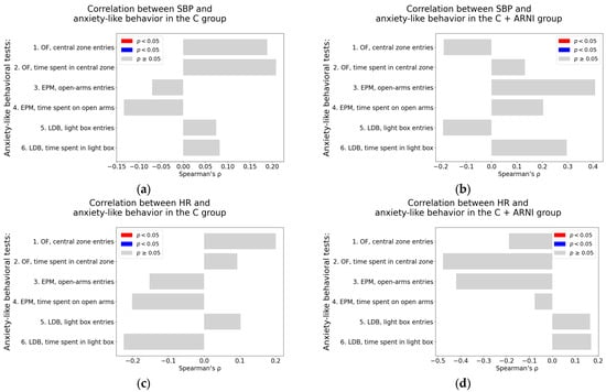 Heart rate. Similarly, HR was not significantly associated with any of the anxiety-like behavioral measures in either the C group or the C + ARNI group (Table A1 and Table A2; Figure 7c,d).