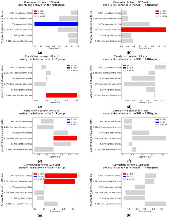 Associations between cardiovascular parameters and anxiety-like behavior in untreated and ARNI-treated spontaneously hypertensive rats: (a–h) Associations between cardiovascular parameters and anxiety-like behavior; (a,b) systolic blood pressure (SBP); (c,d) heart rate (HR); (e,f) left ventricular weight (LVW); and (g,h) left ventricular hydroxyproline concentration, each analyzed in untreated spontaneously hypertensive rats (SHR) and ARNI-treated SHRs (SHR + ARNI), respectively. Anxiety-like behavior was assessed using the open field test (OF), the elevated plus maze test (EPM), and the light–dark box test (LDB). Nonparametric correlation analysis was used to evaluate the associations; Spearman’s rho with the corresponding p-value is reported. Color coding: red bars indicate Spearman’s rho > 0 with p < 0.05; blue bars indicate Spearman’s rho < 0 with p < 0.05; and gray bars represent no significant association. Abbreviations: ARNI—sacubitril/valsartan.