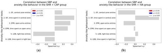 Systolic blood pressure. In the SHR + CAP group, SBP did not show any significant correlation with anxiety-like behavioral parameters (Table A5; Figure 9a). In the SHR + IVA group, a borderline positive association was observed between SBP and the time spent in the central zone of the OF (Spearman’s rho = 0.51, p = 0.07) (Table A6; Figure 9b).