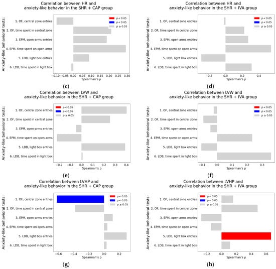 Associations between cardiovascular parameters and anxiety-like behavior in captopril and ivabradine-treated spontaneously hypertensive rats (SHRs); (a–h) associations between cardiovascular parameters and anxiety-like behavior; (a,b) systolic blood pressure (SBP); (c,d) heart rate (HR); (e,f) left ventricular weight (LVW); (g,h) left ventricular hydroxyproline concentration, each analyzed in ivabradine-treated spontaneously hypertensive rats (SHR + IVA) and captopril-treated SHRs (SHR + CAP), respectively. Anxiety-like behavior was assessed using the open field test (OF), the elevated plus maze test (EPM), and the light–dark box test (LDB). Nonparametric correlation analysis was used to evaluate the associations; Spearman’s rho with the corresponding p-value is reported. Color coding: red bars indicate Spearman’s rho > 0 with p < 0.05; blue bars indicate Spearman’s rho < 0 with p < 0.05; and gray bars represent no significant association.